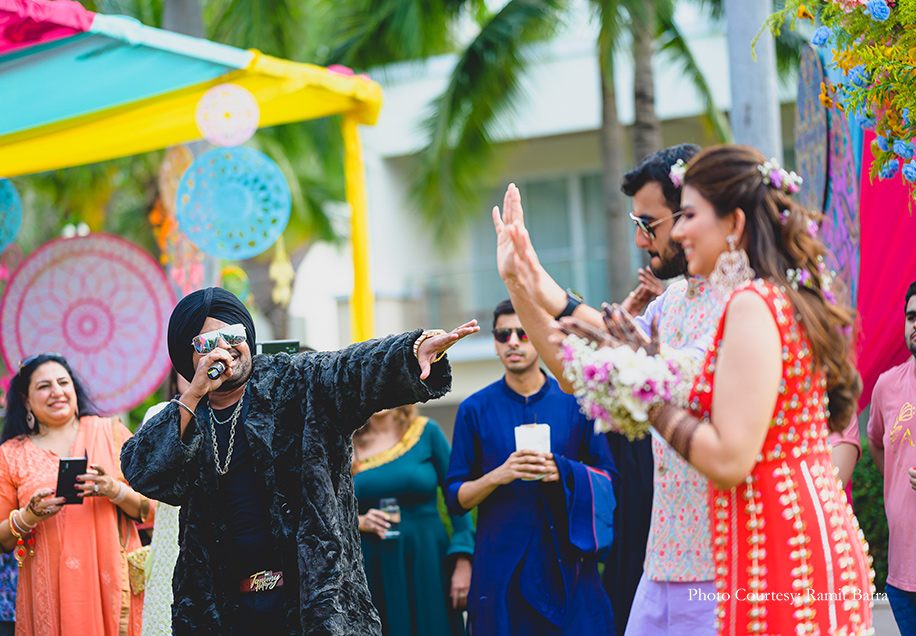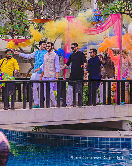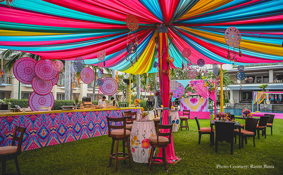 The guests then indulged in a vibrant poolside Mehndi celebration amidst tons of fun. Quirky décor in hues of pink, yellow and blue lent a bohemian feel to the outdoor function, with breezy drapes, dreamcatchers, a beer bar, flamingoes and gorgeous floral accents.