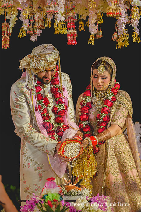 A magical concoction of white, pink and gold, the romantic wedding festivities was a sight to behold against the azure blues. Blush floral arrangements of cherry blossom and other blooms covered the venue as well as the mandap while serene white seating and dinner settings kept the décor elegant. The bride wore a beautiful blush pink Sabyasachi lehenga with rich Polki and meenakari jewelry while the groom complemented her perfectly in a white, pink and gold sherwani.