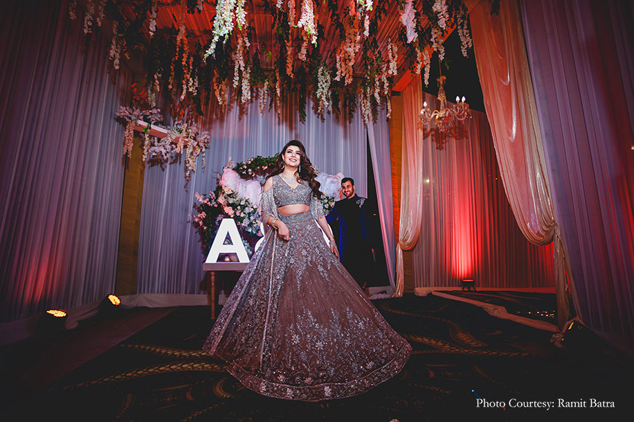 The festivities kicked off with a vintage glam cocktail abundant with rich, warm lights and lovely floral décor in pastel hues with pampas grass, antique chandeliers and LED signages. The groom looked elegant in a navy velvet bandhgala while the bride shimmered in a silver embellished lehenga for this function.