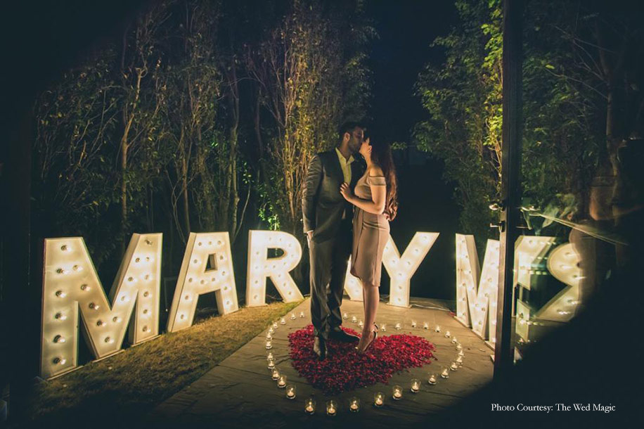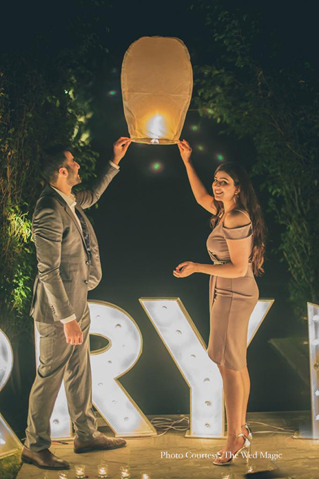 After three years of blissful dating, Divij popped the question with a surprise proposal planned at the Roseate Hotel. Stepping into the room filled with her favorite flowers, fairy lights, cake, and champagne, Anushka was rendered speechless when the blinds opened up to show ‘Marry me’ in the marquee lights outside.