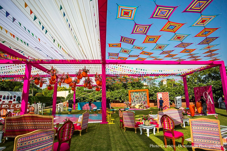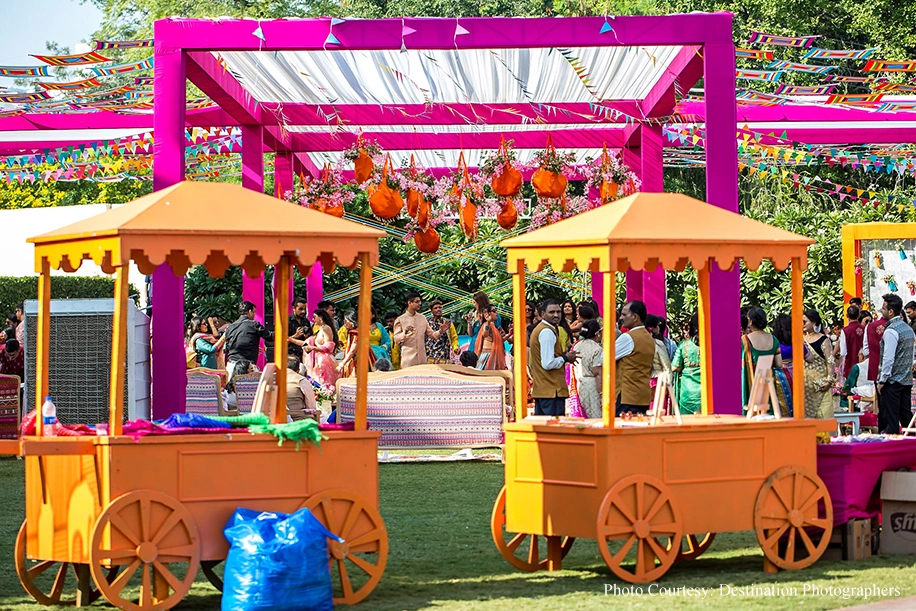 Shashank shares, “Being the first event, we wanted it to be a fun afternoon. With all the vibrant colours with a touch of Rajasthani elements, the event had a carnival-like vibe. Hence, the activities planned were also in sync with the theme – a puppet show, a live bangle maker, popcorn and candy floss station. This was also the first time that both families were coming together. To make their mingling smoother we also organised ice-breaking games with an engaging emcee and turned it into a fun competition between the bride’s side and the groom’s side.