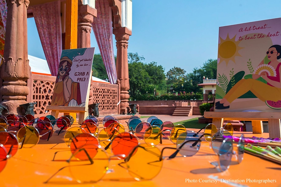 Both, Anushka and Omkar are individuals who are very exuberant. Keeping this in mind, the couple had a high-energy entry with a playful song in which the bride was driving a rickshaw with the groom as her passenger. A photo booth, a stunning entrance arch and the bridal seating area accentuated the decor while the ladies enjoyed giveaways like DIY Potli counter for ladies to mix and match bangles, bindis and potlis as per their outfit along with stoles. While hand fans and sunshades were provided to beat the heat along with quirky signages.
