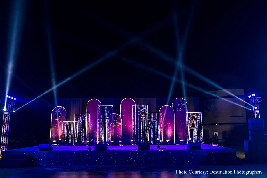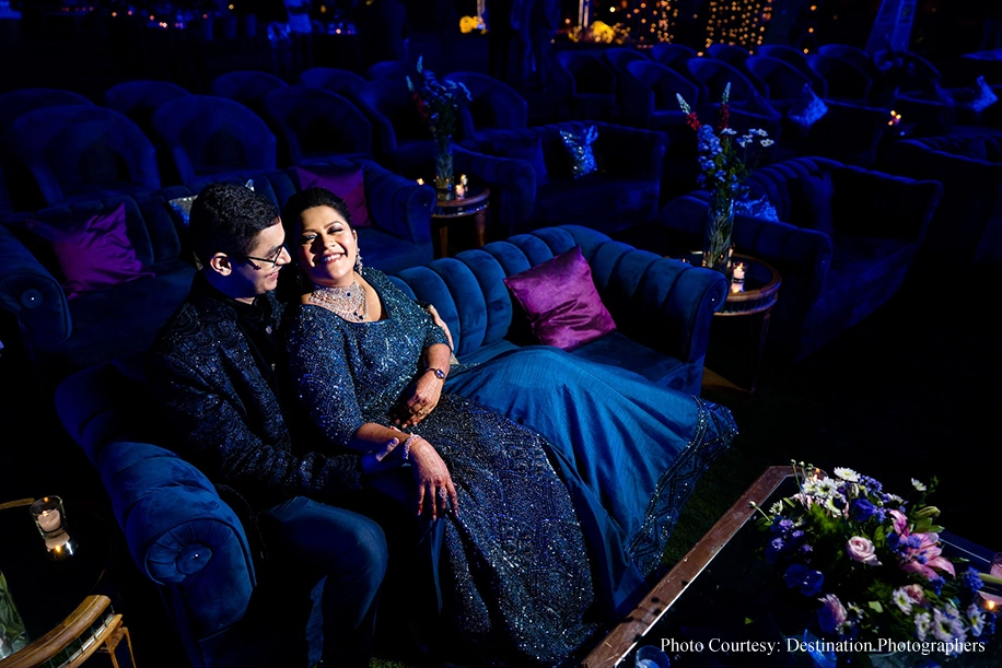 Zashank shares, “The theme for the night was ‘Get your bling on!’ We wanted to fully use the open space and the colours we used were shades of purple along with shimmer in silver and gold. The highlight of the decor was the entrance arch, bar and stage. While the bride’s and the groom’s sides competed via dance performances, Omkar’s mom performed the traditional Maharashtrian lavni. The couple’s performance was the last one after which the after-party began.”