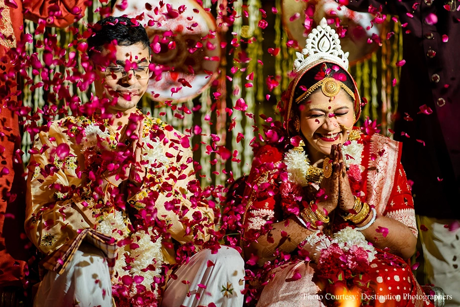 They were welcomed by the bride’s family as per the Bengali traditions and the groom was made to wear a topor – Bengali headgear for the groom. Post this, he was taken to the Jaimala spot where the bride entered holding betel leaves in front of her face with her brothers holding the phoolon ki chaddar.”