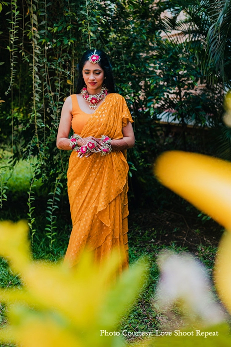 For their Haldi ceremony, Areej and Harsh chose to take a more traditional route with decor that was swathed in hues of yellow and red. Held on one of the resort’s vast lawns and lit up by the sun, the Haldi event exuded joy with elements like bangles, flowers and daffodils in the decor.