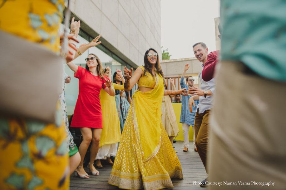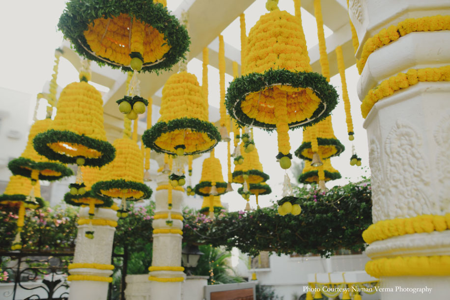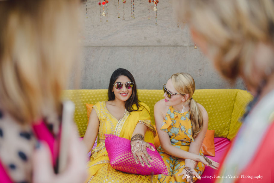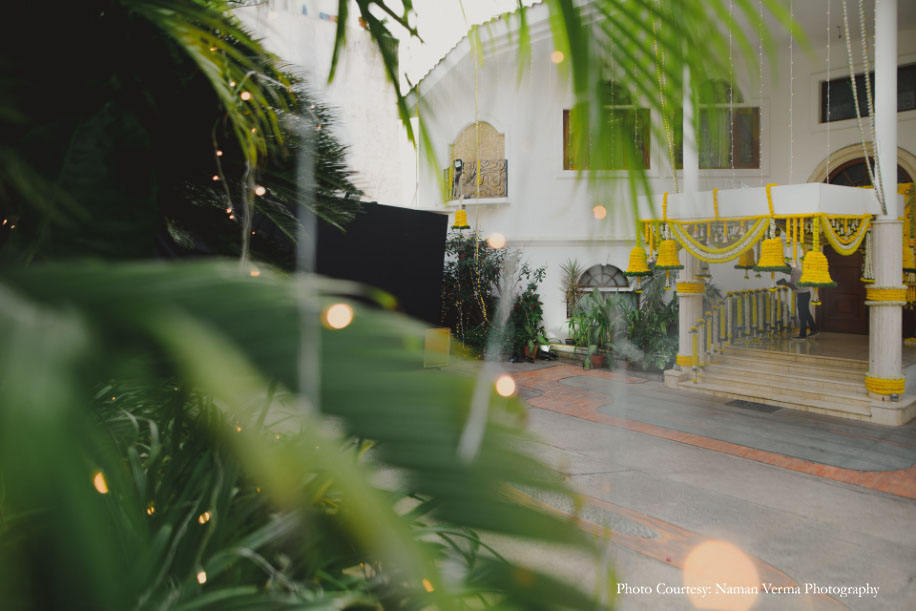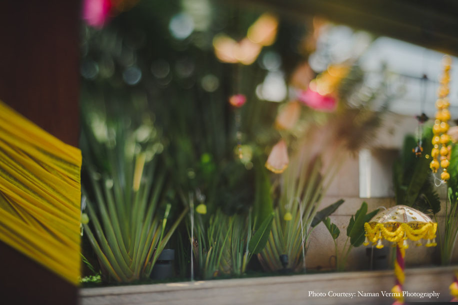 All things bright characterized the mehndi function. The venue by the pool was brought to life with the decor in popping colors, a beautiful seating area for the bride, adorned with colorful Rajasthani elephant hangings, vivid drapes, floral arrangements and more. While the surroundings were vibrant, the bride matched the colorful vibe by wearing a bright yellow lehenga by Anita Dongre.