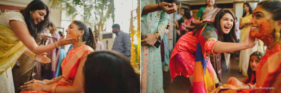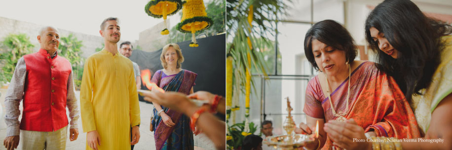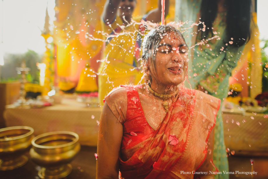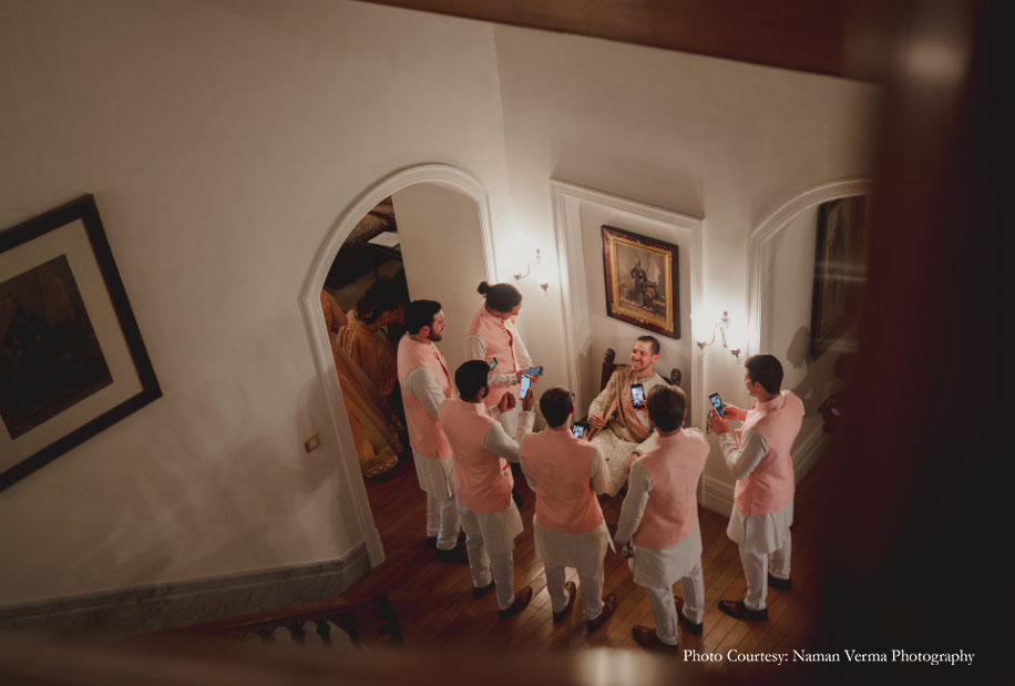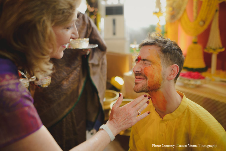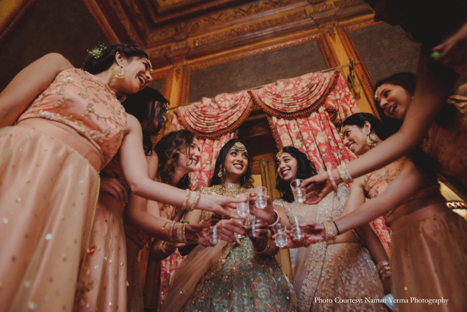 In true tradition, the wedding began with a haldi. Held in the beautiful outdoor spaces of the palace, the décor featured fresh flowers in a palette that resonated with the bride and groom’s vibrant outfits. Playful and lively, the underlying sentiment at this event came courtesy Ashna’s choice of attire – her grandmother’s wedding sari! Brett wore light green to complement his bride.