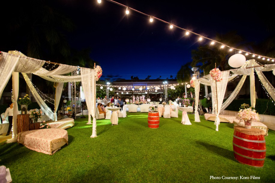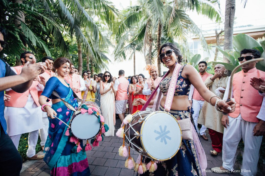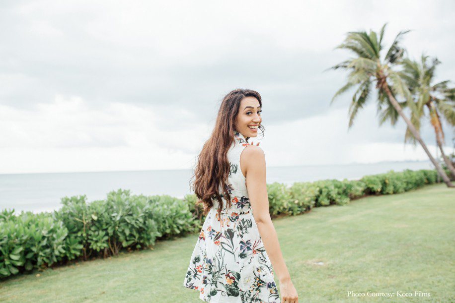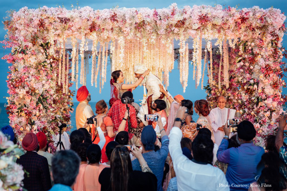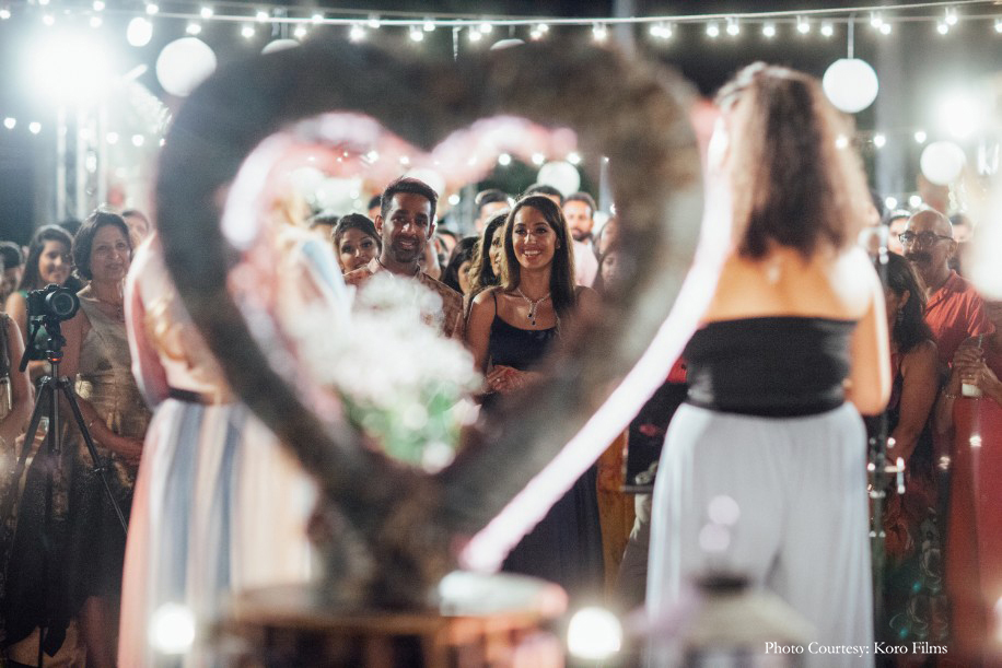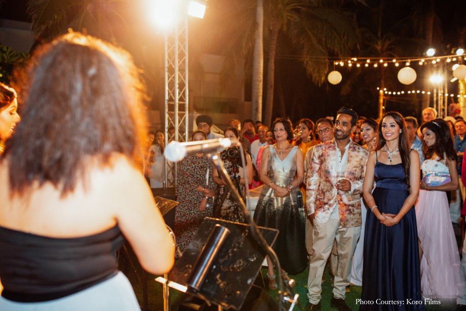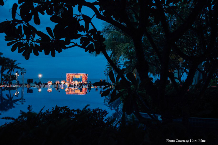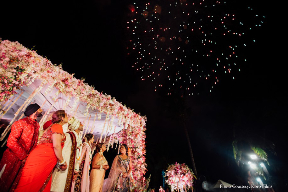 The traditional Hindu wedding ceremony took place in the evening on the beach. The mandap was decorated with pink floral arrangements and commanded a great ocean view. The groom made a grand entrance with his baraat on an all-terrain vehicle, a baraat truck, DJ and his best friend MCing while the bride arrived with her brothers under a floral canopy. The bride shares, “We were both lifted by our brothers for the varmala ceremony. After the pheras, everyone enjoyed a spectacular firework display including a sparkler waterfall behind us. Once we were done with the dinner on the lawn, an open mic session started where our near and dear ones gave some beautiful singing performances. My mum even sang, which was an emotional moment for me.”