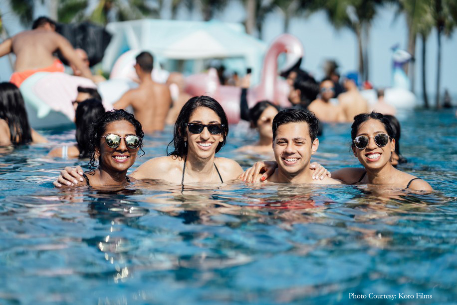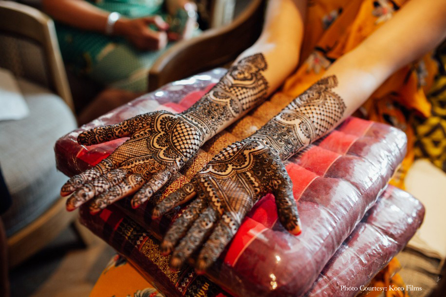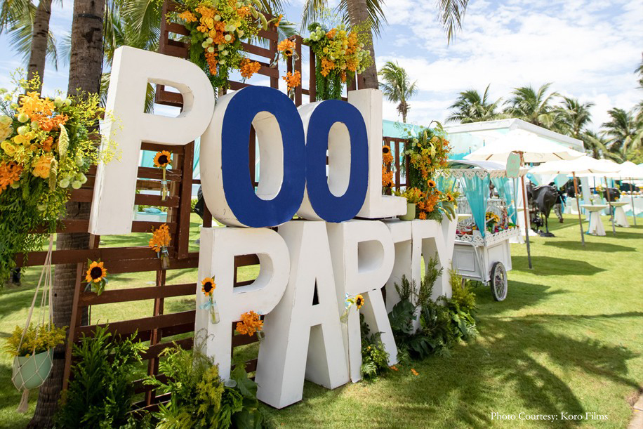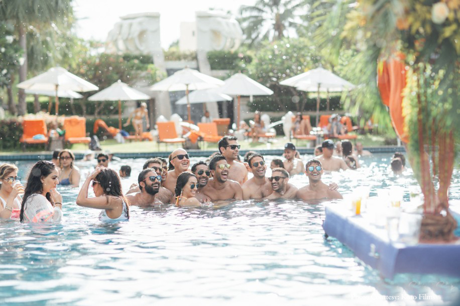 The decor theme for the mehndi pool party included a color palette of cyan and white with accents of yellow. Prab shares, “We had a small ‘dholki’ (Indian hand drum) which family members played as they sang folk songs. Avi and I entered under colored canons held by our friends. The first few hours were all about mingling, and it gradually turned into a buzzing pool party with floats, games and lots of people being pushed into the pool! I wore a beautiful canary yellow lehenga by Priyanka Jain.”