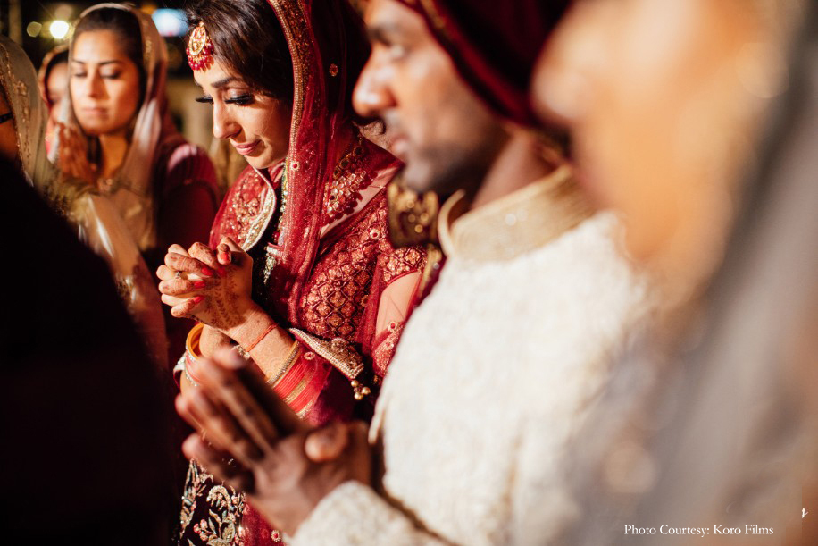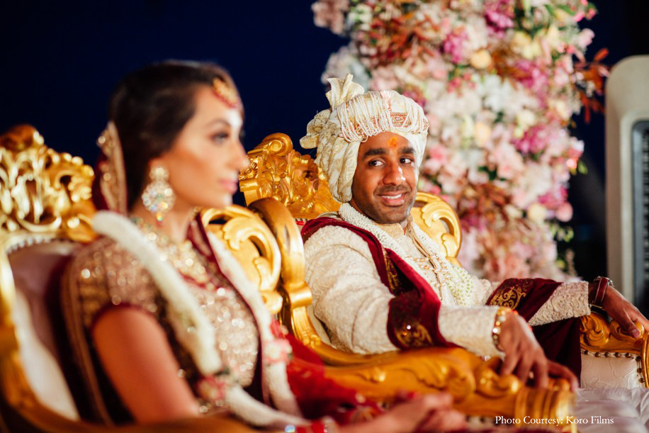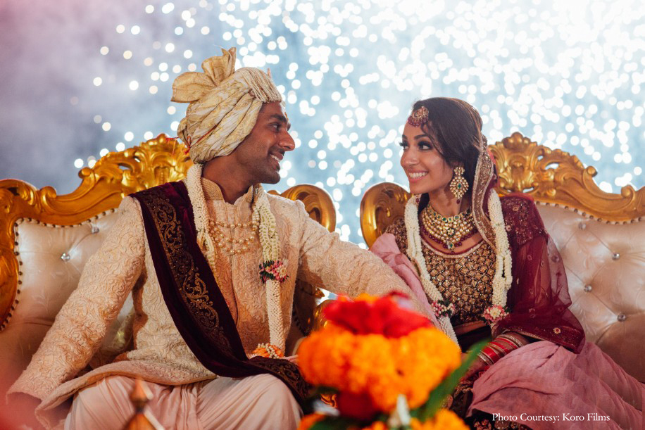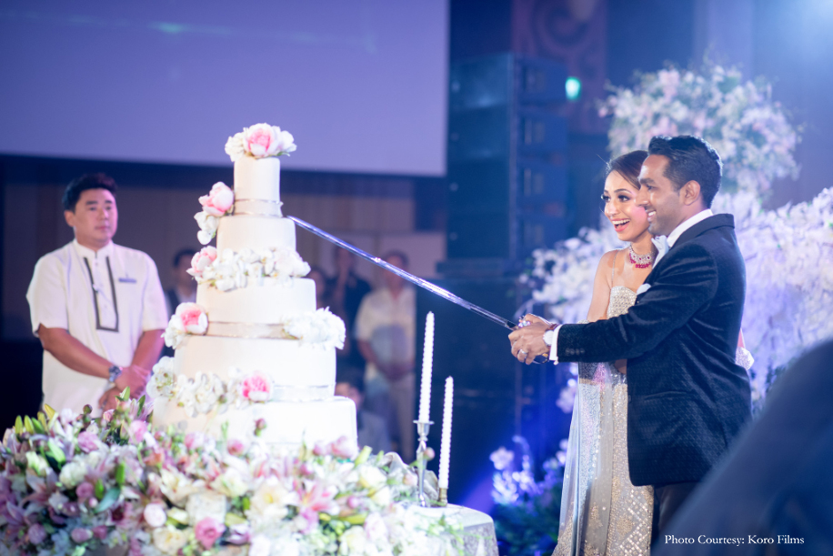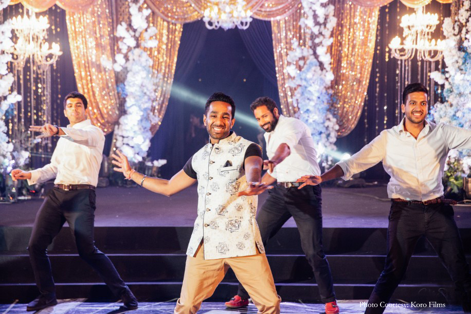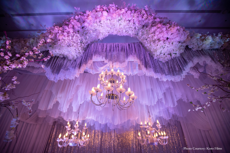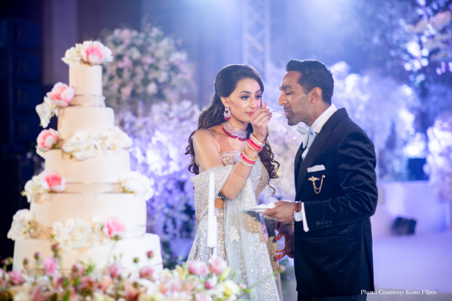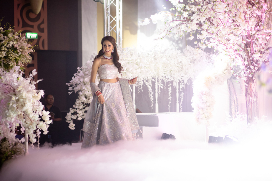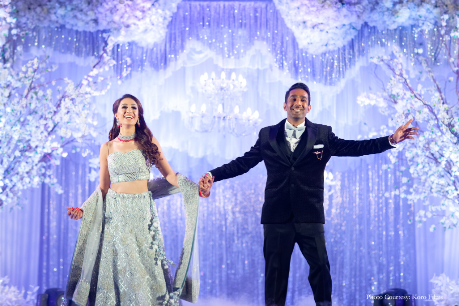 The celebrations concluded with a glitzy reception. The theme for the decor was ‘White Winter Wonderland,’ and the dress code was centered around glitz and glamour. Avi and Prab’s close cousins and friends made grand entrances as the couple came on to the stage secretly which had dry ice that created a camouflage while the guests were expecting them to enter through the main door. There were lots of speeches by friends and parents which were fun and made the couple emotional. Guests also waved glow sticks that were personalized with the wedding hashtag.”