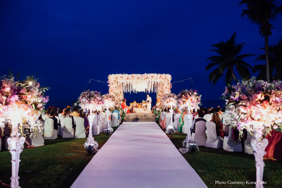 Avi and Prab’s wedding in Thailand was a sparkling affair with a waterfall of fireworks, a secret stage entrance, and pheras on the beach.