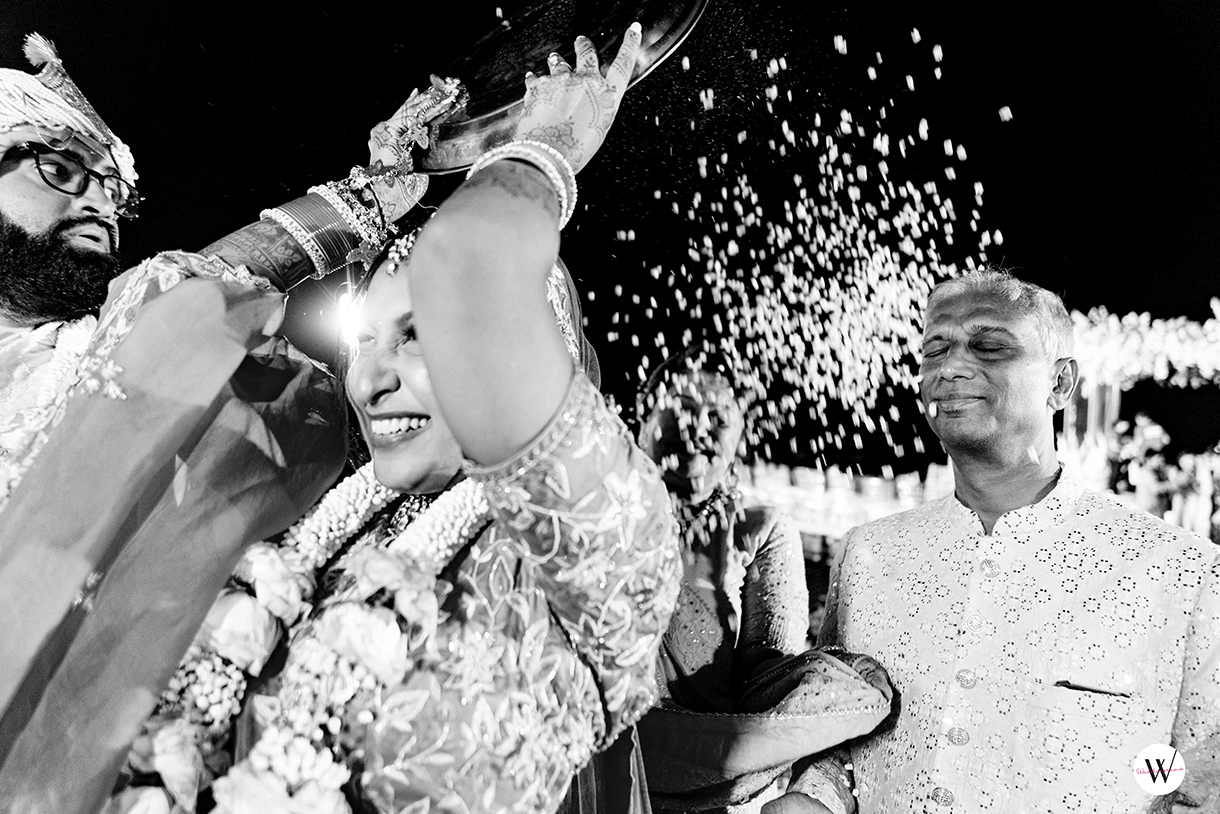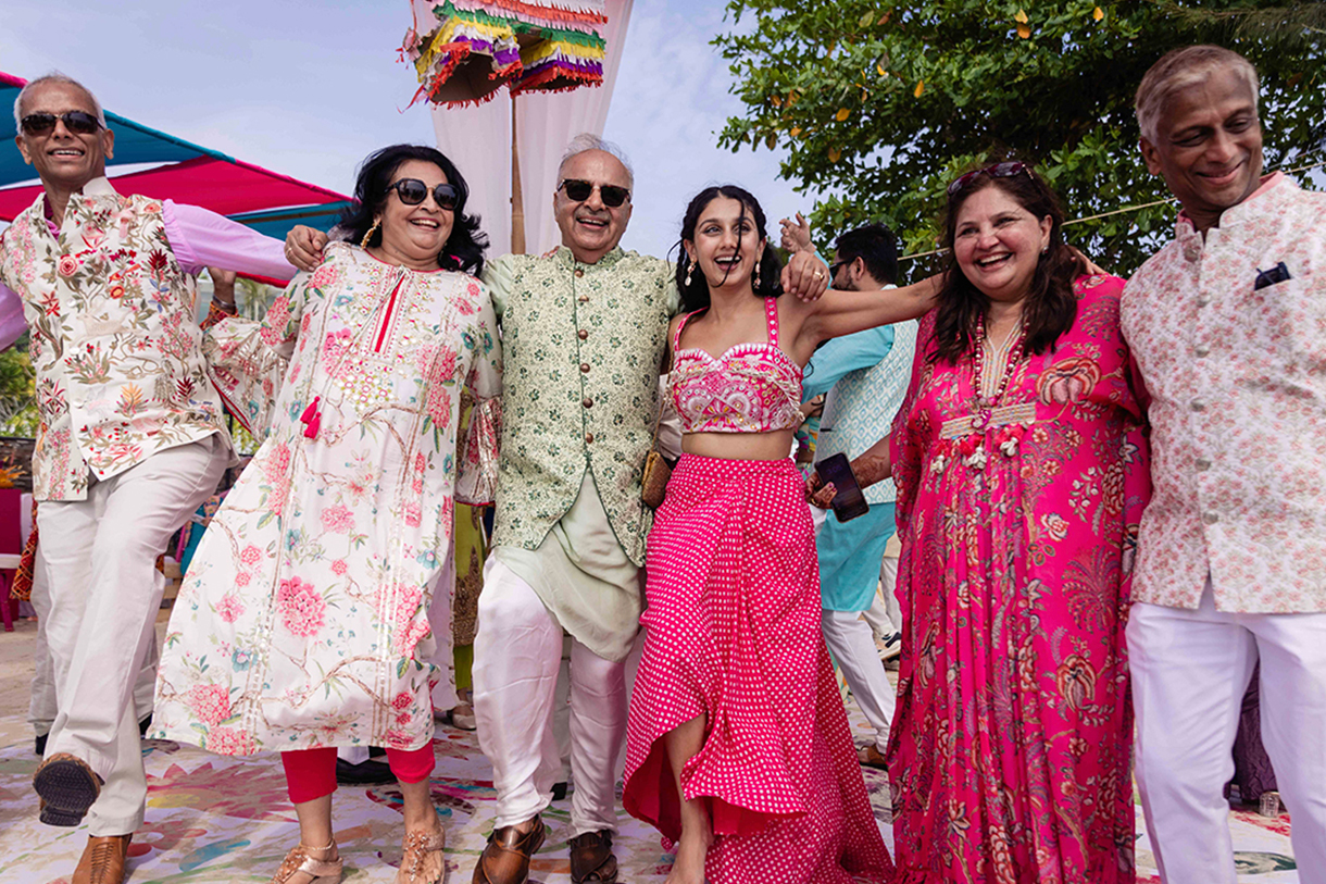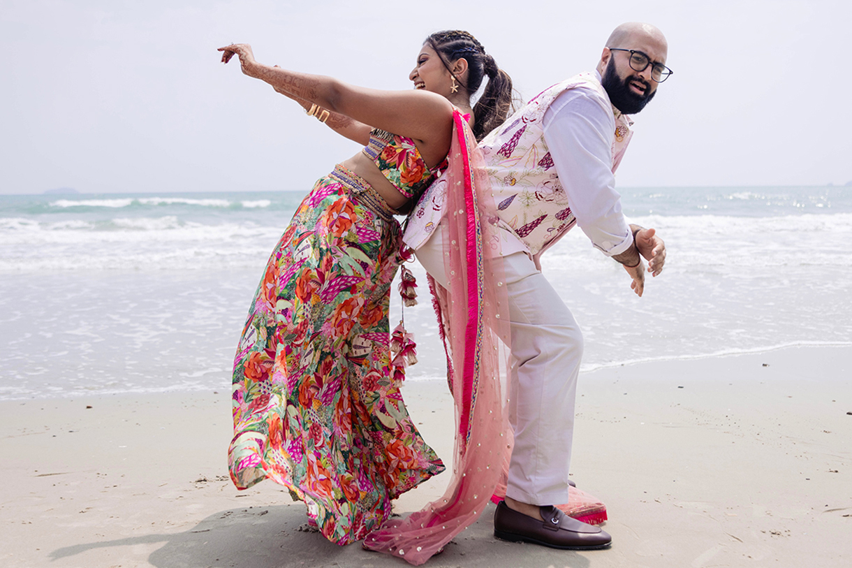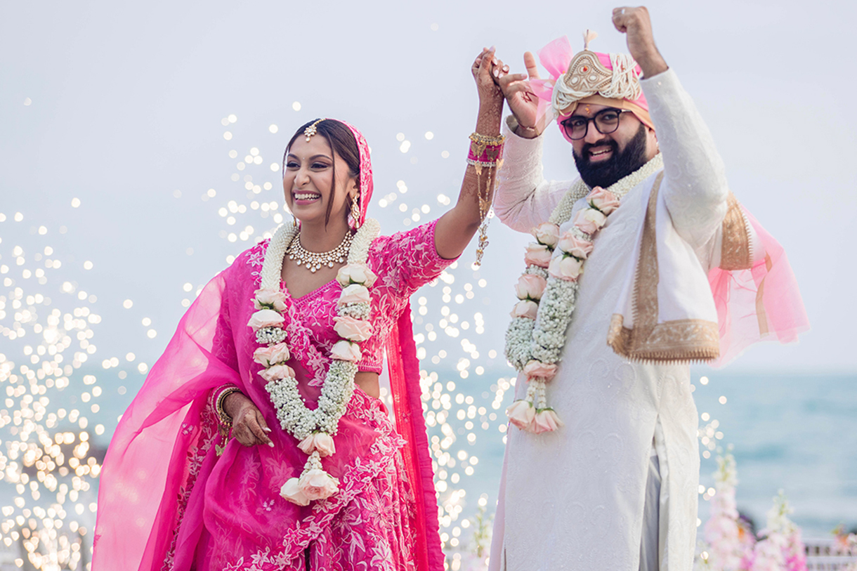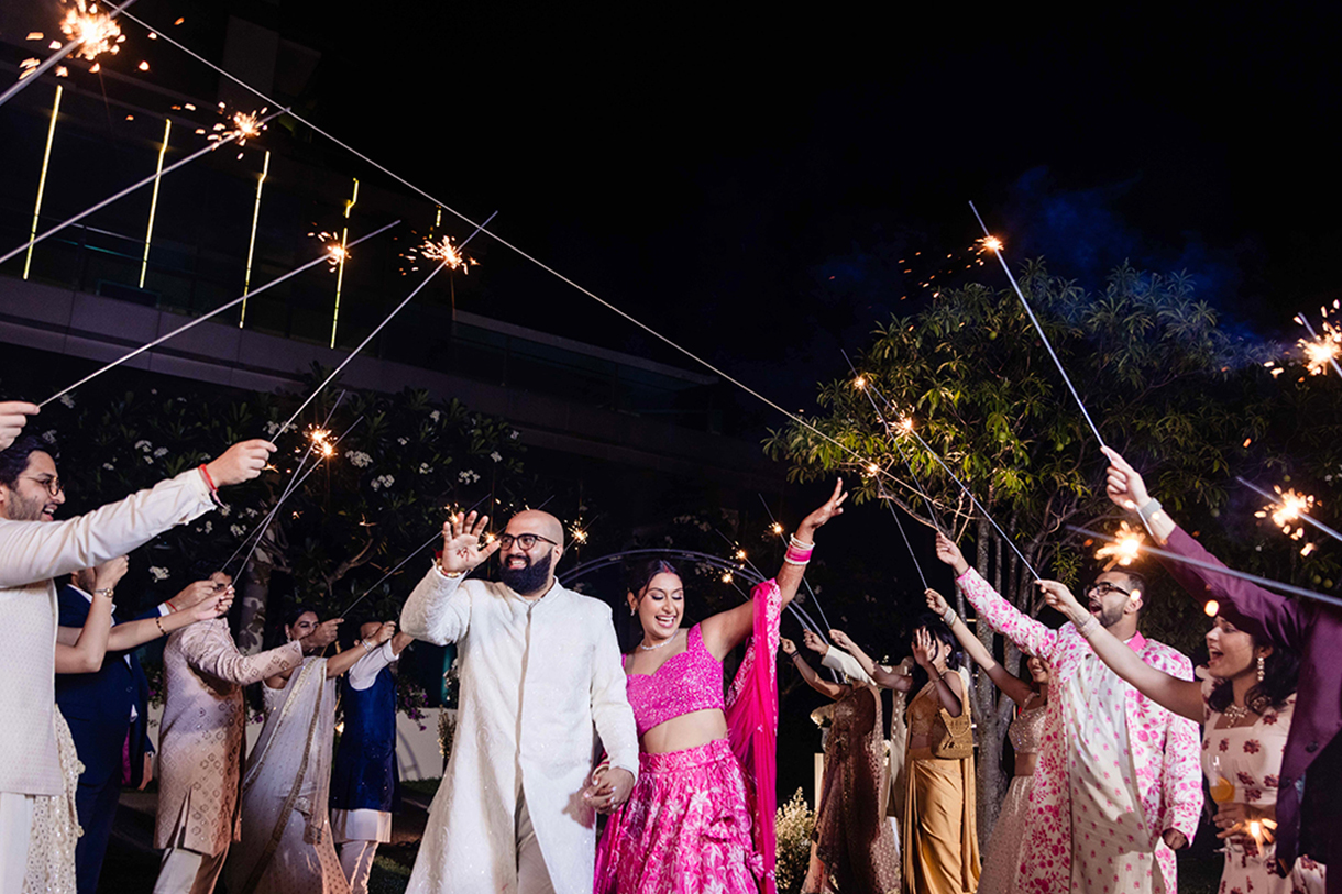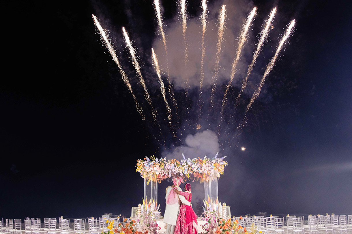 The couple shares, “We had a sundowner wedding by the beach. For the décor, I’ve always been a rainbow girl and wanted the décor to reflect this tastefully. So, we did a floating floral aisle over the pool in a rainbow palette and a matching acrylic mandap against the backdrop of the sea. Sparklers glittered in the background as we exchanged our varmalas, and we had fireworks light up the sky once the ceremony was over. Later, we danced the night away to classic Bollywood numbers!”