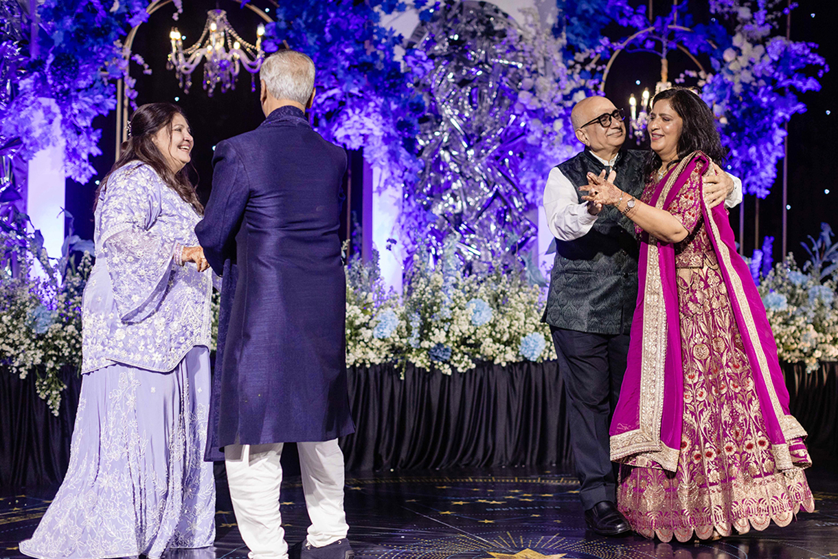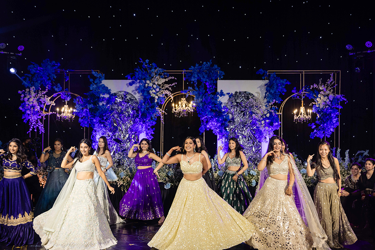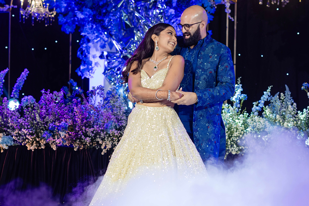 The sangeet, named ‘Stardust Soirée’ transported guests into a celestial wonderland where they felt they stepped into a world where the night sky meets elegance. Avina recollects, “Ambient lights, energetic performances and delicate blooms gave this event a soothing yet glam vibe. In addition to dance performances by family and friends, our emcee also made us play a ‘cooking’ game based on Lax’s and my shared passion for cooking.”