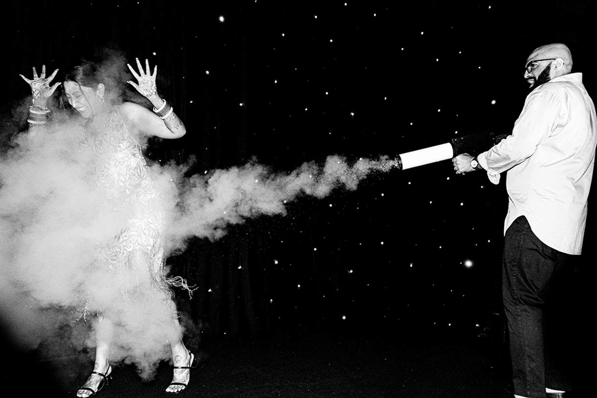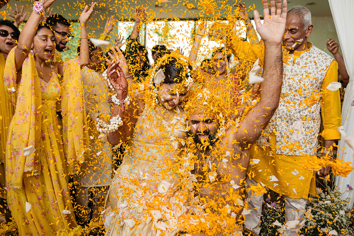 “While we got all guests to wear yellow, I didn’t want the décor to be overly yellow so we opted for pastels to match the pastel florals on my outfit. My favourite décor element for this event was the origami cranes we had hanging from the ceiling. Lax was the most excited for his Haldi – over the years, he has got his friends messy at their Haldi and he knew they were coming for revenge! Overall, this was an incredibly fun event where everyone was at their playful best”, shares the bride.