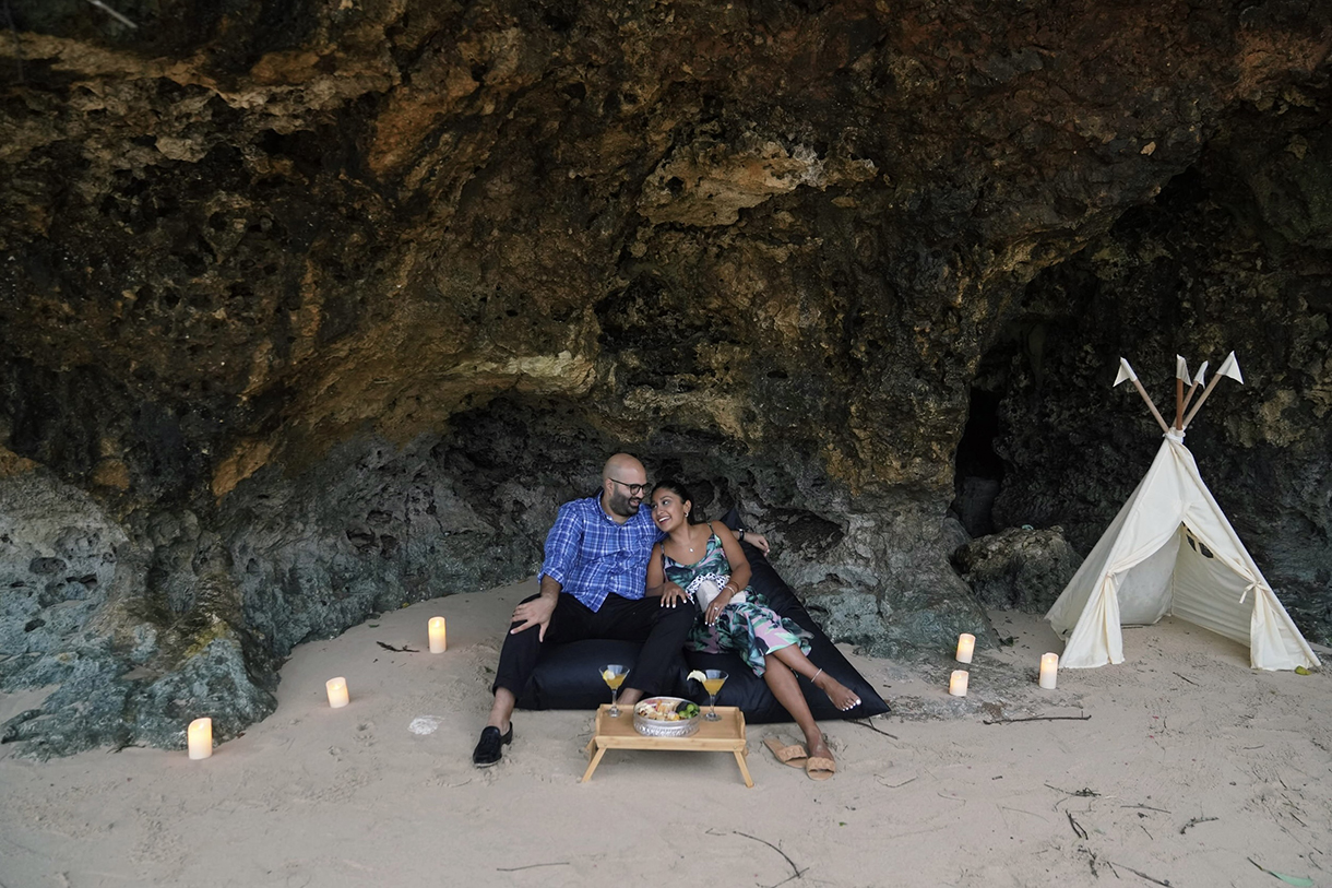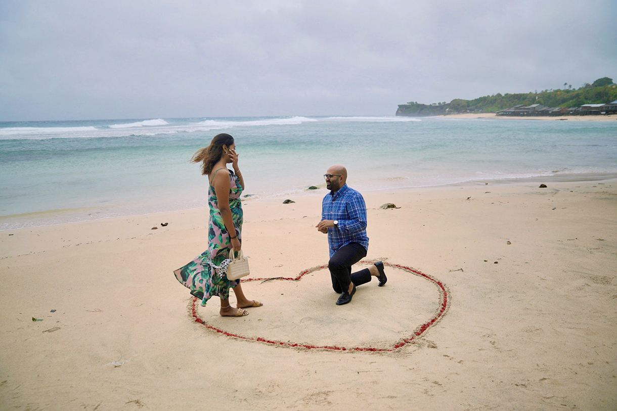 We finally reached a hotel lobby in Uluwatu where someone was waiting for us who put a blindfold on me. Lax took my hand and we made our way to a flight of stairs. Once we reached the bottom of the stairs, he lifted my blindfold and in front of me was a beautiful beach enclave – turquoise waves crashing against a backdrop of dramatic cliffs. On the beach, there was a heart made of rose petals and in the middle of the heart, stood Lax who went down on one knee and popped the question. After I said ‘yes’, we celebrated with gin cocktails, a scrumptious cheese platter and sparklers – a man after my own heart! We sat on beanbags with a bonfire set up savouring every minute of the special moment. We then headed back to our villa where our families were waiting to celebrate with us. It was exactly what I wanted – a private proposal with an opportunity to celebrate with my loved ones after.”