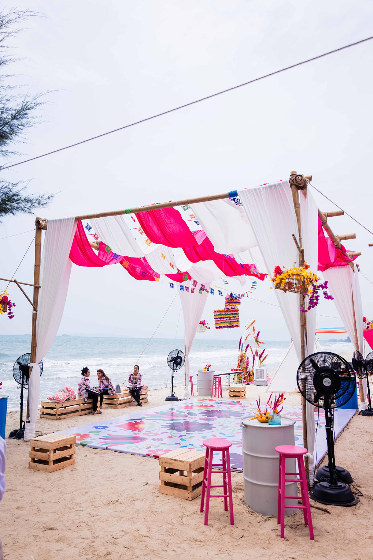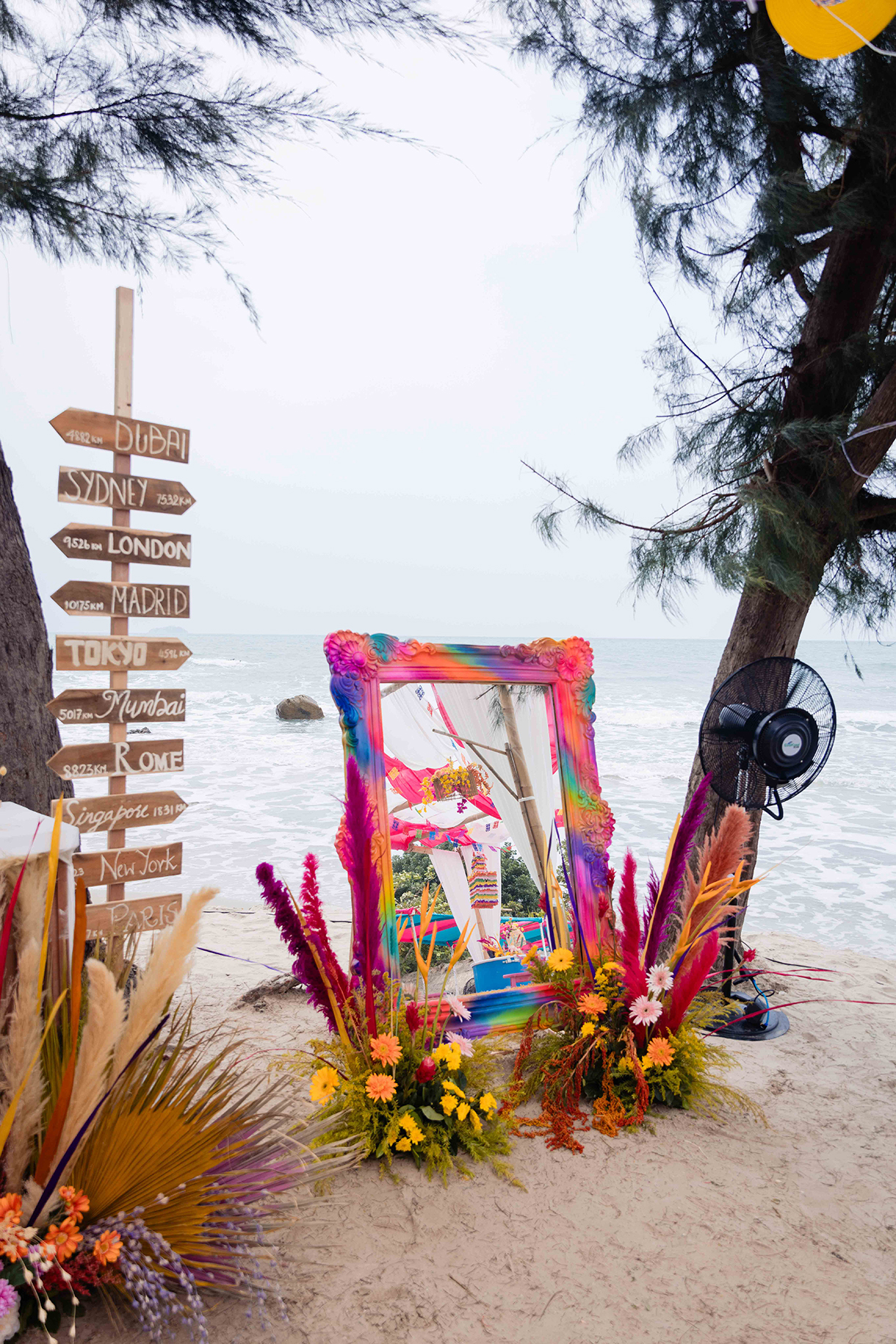 This couple’s colorful beachside wedding mandap made a striking impression against the sea waves and showcased their exuberant personalities.