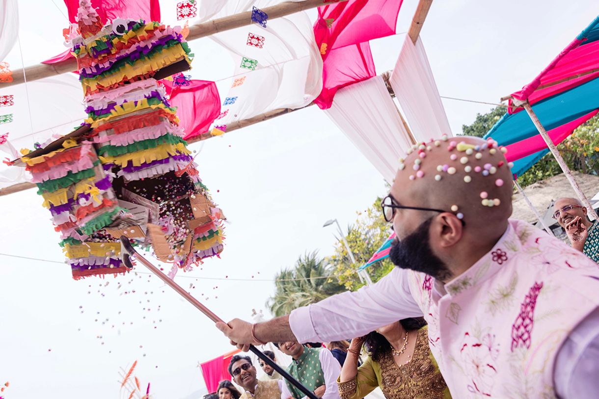 “Think a riot of colours, chaos and crazy – but in the best way! This was hands down our favourite event. I’ve always wanted a non-traditional Mehendi event and a fiesta by the beach sounded perfect. And, a Fiesta means pinata, tequila and siesta (for those at the massage corner!) so these were some of the elements we included. For favours, we handed out evil eye bracelets and face crystals which tied back to the theme. From the beats to the booze (cocktails were called Muy Passionito and Piña Mamarita), the vibe of this event was a 10/10”, shares Avina