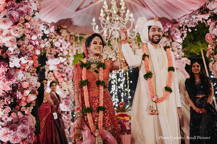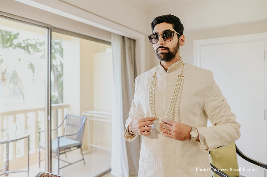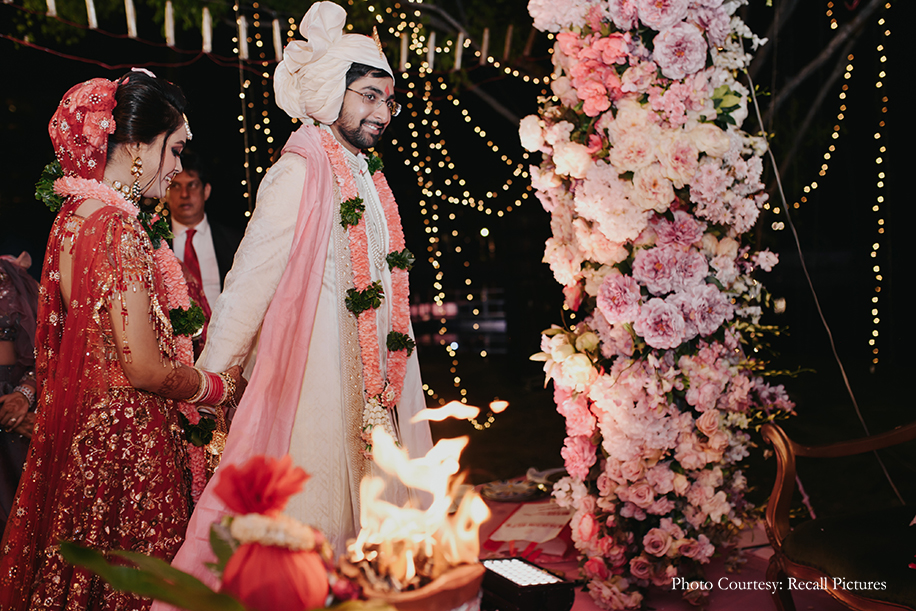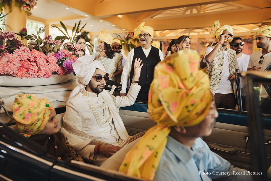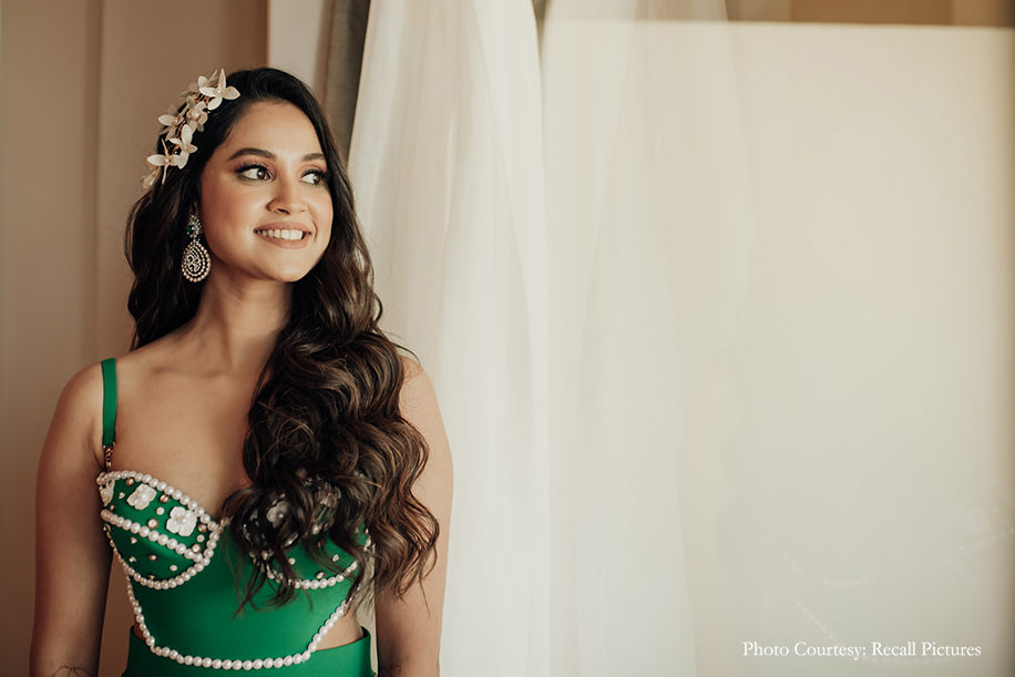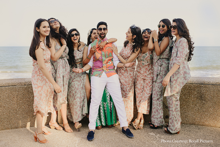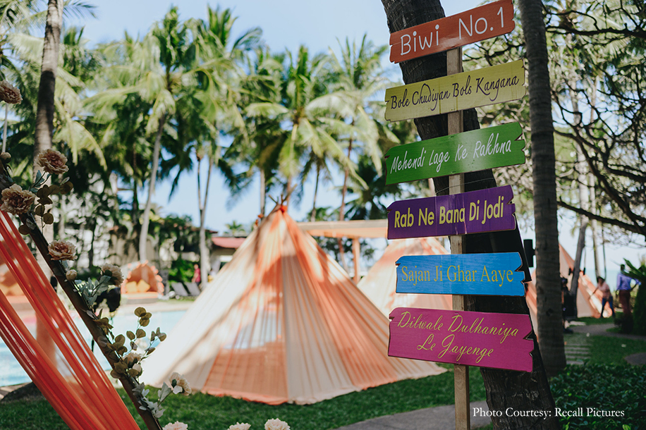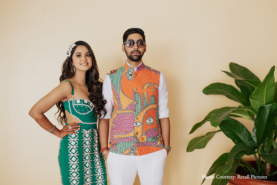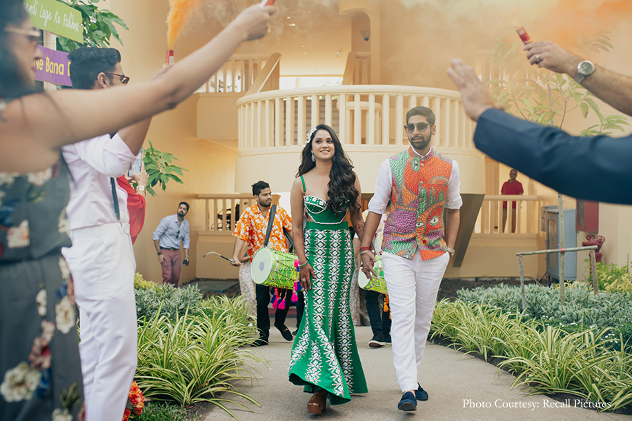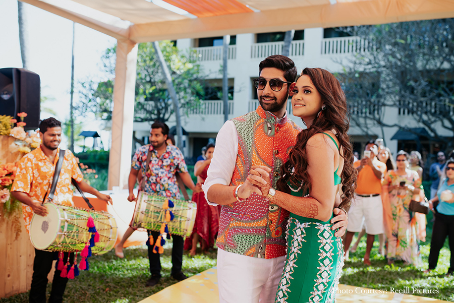 On the following day, a boho-chic themed pool party was held, the decor featured teepees and coral drapes. The bride channeled quirky elegance in a beaded green dress, sunglasses and floral hair accessories. The groom stood out in a vibrant orange and pink bandi jacket.