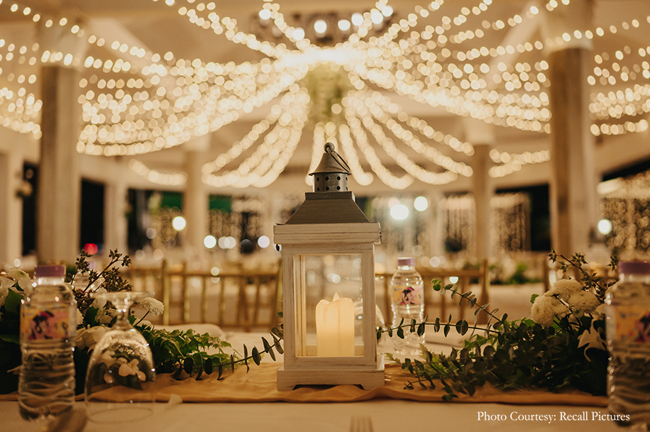 The couple made a grand entrance with fire dancers performing. This was followed by a spectacular fire show on the beach. The rustic yet elegant decor featured fairy lights, wooden structures and splashes of green leaves and vine arrangements on a long, communal dinner table. The bride looked alluring in a violet and black ruffled dress, while the groom wore a stylish blazer with chinos.
