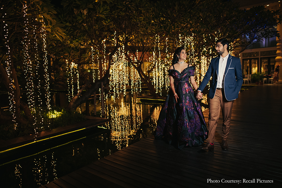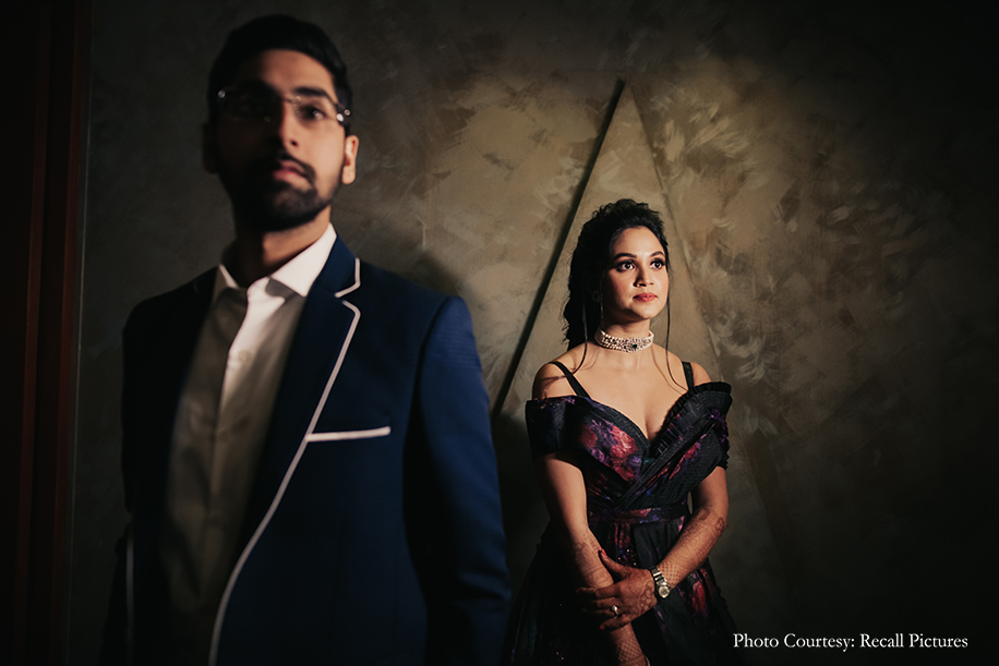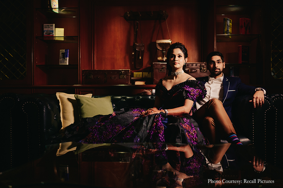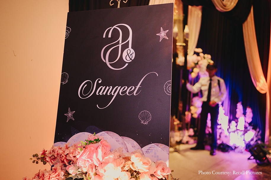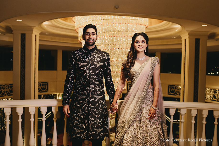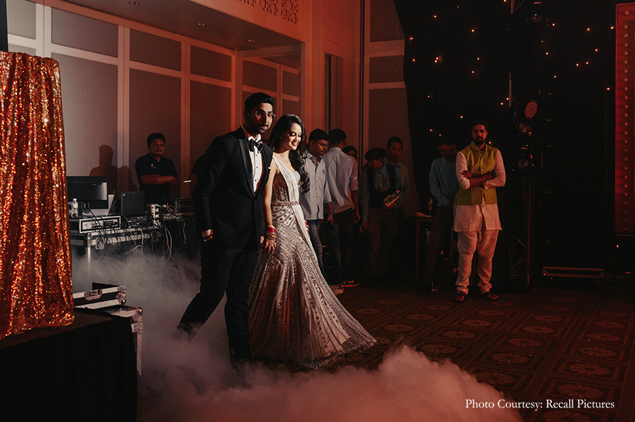 A huge neon sign with the couple’s hashtag was the bar’s backdrop, welcoming guests into the ballroom, which was decked out spectacularly with flowers and chandeliers. A color combination of navy blue and gold, along with an abundance of pale pink flowers and sleek modern metallic structures made for striking decor. The bride shimmered in a stunning silver lehenga, while the groom wore a black and silver embroidered sherwani.