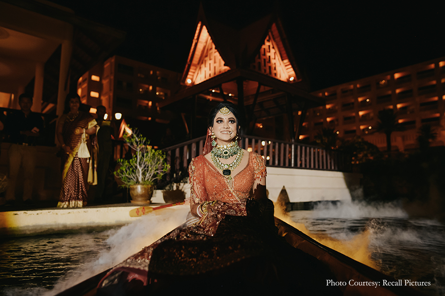 The baraat entered with all the pomp and splendor of an Indian wedding. The groom arrived in a turquoise vintage car courtesy of Thai Tourism. The spectacular function featured a number of grand displays that included smoke bombs and cold pyros. The wedding mandap was all things pink – from the aisle to the altar – in varying hues and textures. The bride made her entry on a boat, sailing across the Dusit Thani Lake, with dry ice and smoke surrounding her. After getting off she walked in under a traditional phoolon ki chaadar dressed in a beautiful red Tarun Tahiliani outfit.
