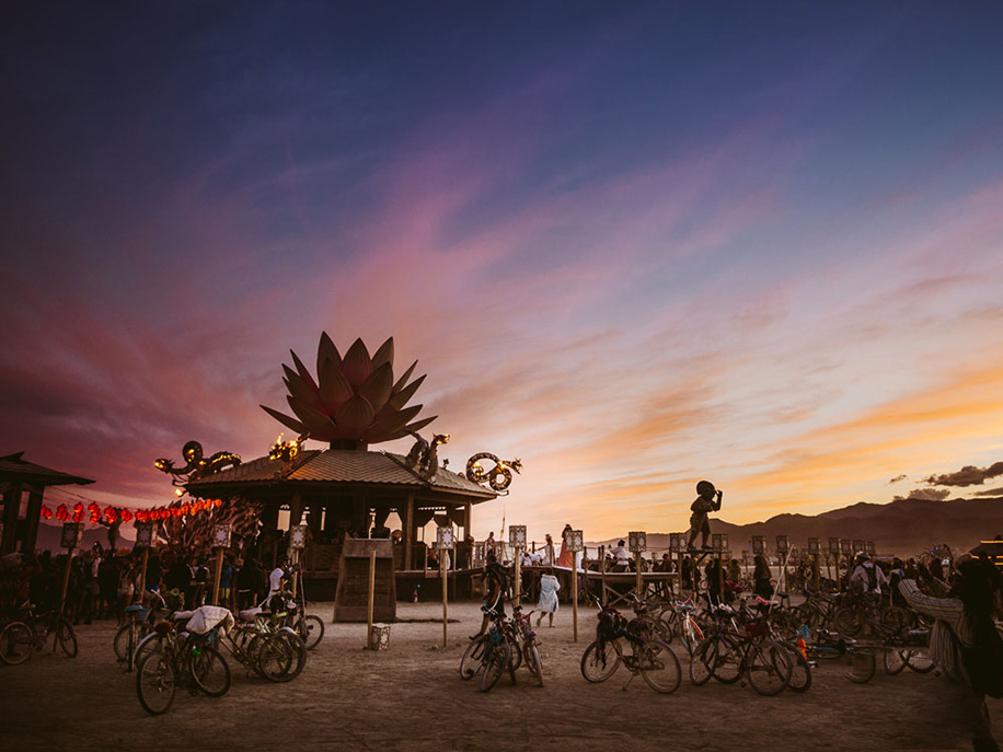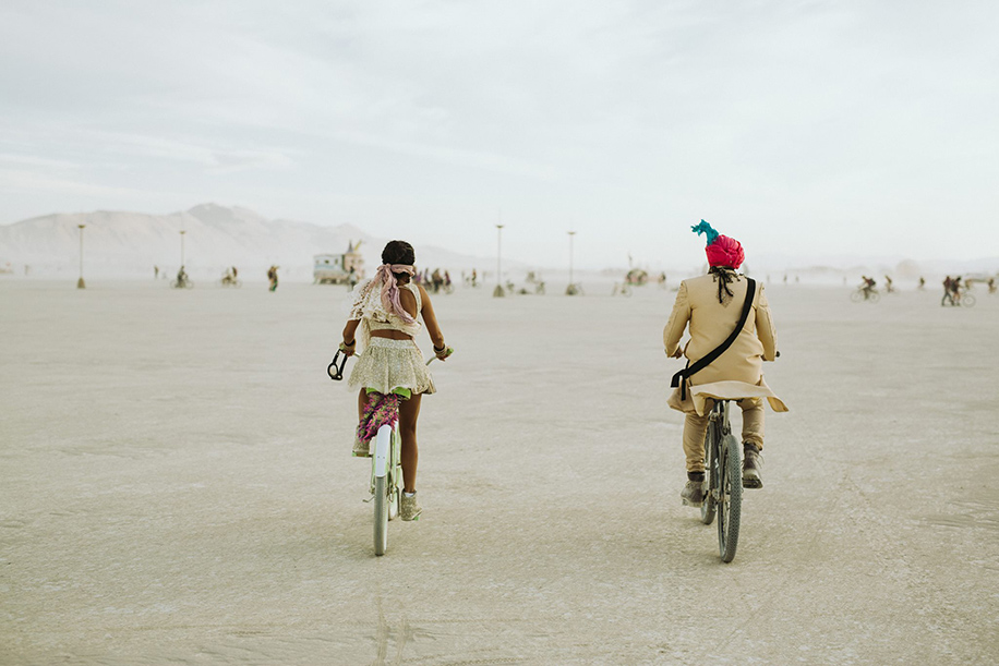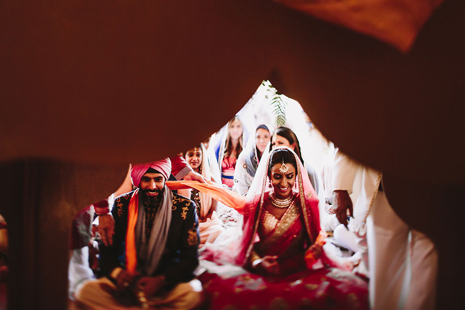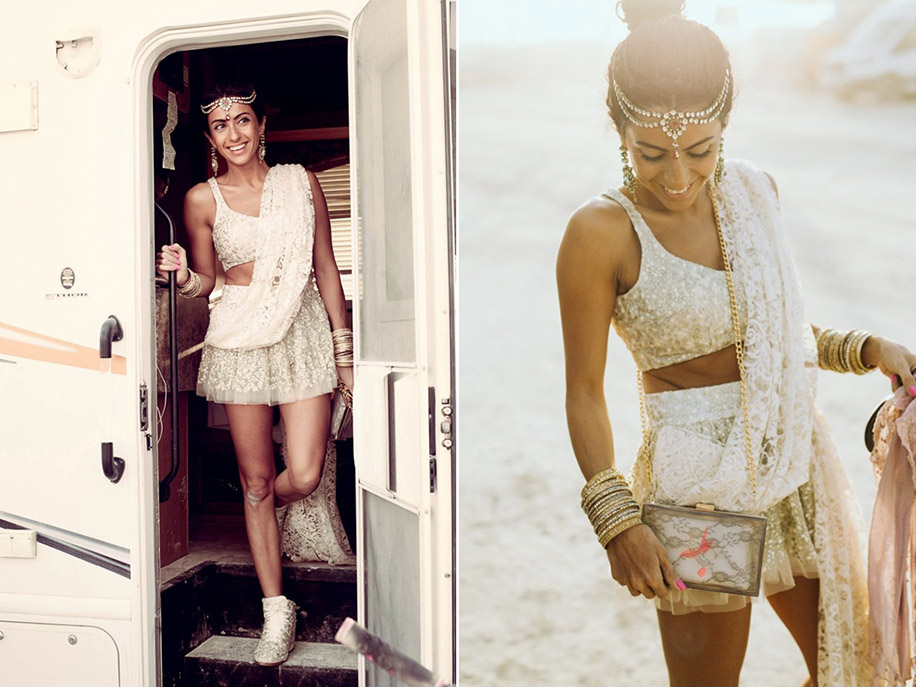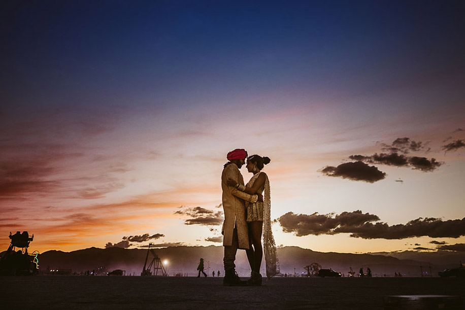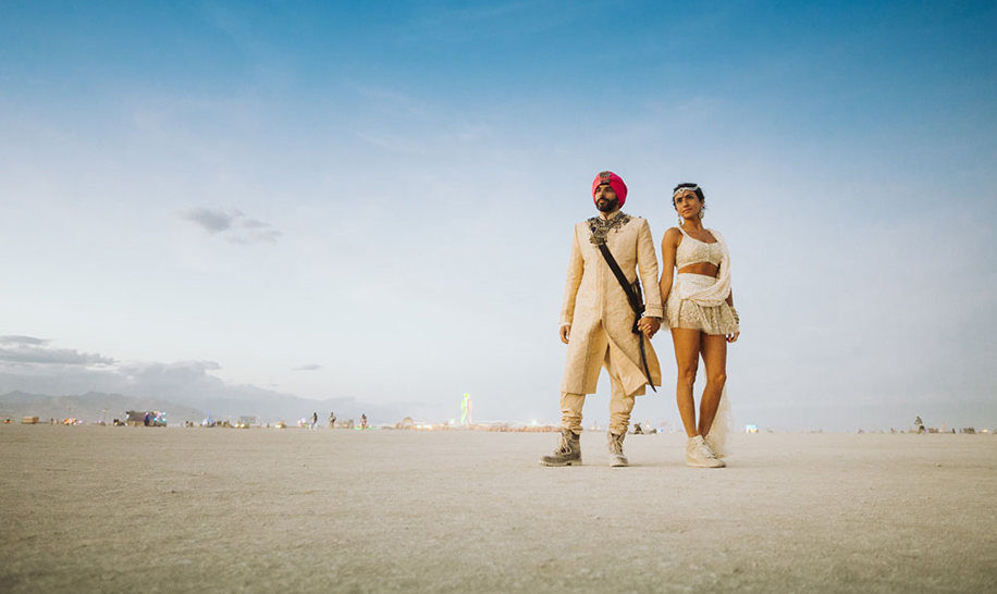 The couple traveled all the way over from Dubai to be married in the Black Rock Desert, Nevada at Burning Man. The ceremony was held at the Mazu Temple and luckily no one else had planned their ceremony at the spot and time as the couple did! There were two other ceremonies in other parts of the temple and one looked like a Dothraki wedding out of Game of Thrones. The couple rode to the ceremony on bicycles as Arjun wore an outfit that perfectly matched with the theme of Persian Princesses and Indian Maharajas and Azadeh adorned a mini skirt sari by designer Reema Ameer paired with Nike wedges customized in the same hand embroidered fabric. The bride was holding a transparent box clutch with a pouch that had embroidered ‘baleh’ on which translates into ‘yes’ or ‘I do’ in Farsi. She also added ‘eek onkar’ which translates into ‘one supreme reality’ in Punjabi. They exchanged rose gold wedding bands from Vik Jet Fine Jewellery, and Azadeh wore a headpiece and earrings given to her by her mother-in-law. The inspiration for their wedding was their cultures and having traveled together across India, Iran and 21 different countries. They also used elements that inspired them in their travels so far.