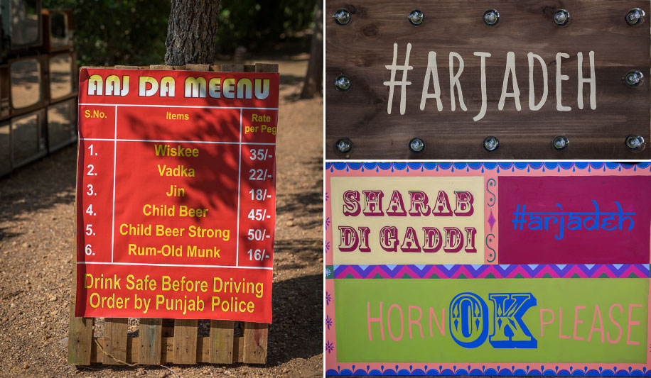 “A colorful Punjabi village and market with stalls of snack, popcorn and ice-cream, bangles, bindis, handmade dolls, ‘kaleeras’ (bridal wrist danglers) and other giveaways were arranged. We also had a colorful rickshaw and an Indian tractor-art as our bar. An authentic looking bar menu that looked like it came straight from the Punjab with the typical funny English misspellings and drinks like “Jin” and “Wiskee”. A ceiling of Jaipuri umbrellas and stringy fairy lights covered the area. For the ceremony, we had strings of pink and white roses hanging from the gold-painted wooden structure I had built to respectfully cover the Sikh holy book.” Azadeh was born aloft a minimalist wooden ‘doli’ (palanquin) that was festooned with garlands and carried by four men.