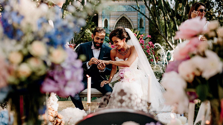 Azadeh Roshan and Arjun Ahluwalia’s 500-guest reception took place in the garden of Arjun’s parents’ home in Jumeirah, Dubai. It was organised by Arjun’s mother, a wedding planner. Azadeh is wearing a Sabyasachi lehenga with a headpiece and earrings from her mother’s heirloom pieces. Arjun wore a ivory suit by Sartor, with blue Jodhpuri-style pants to match Azadeh’s look.