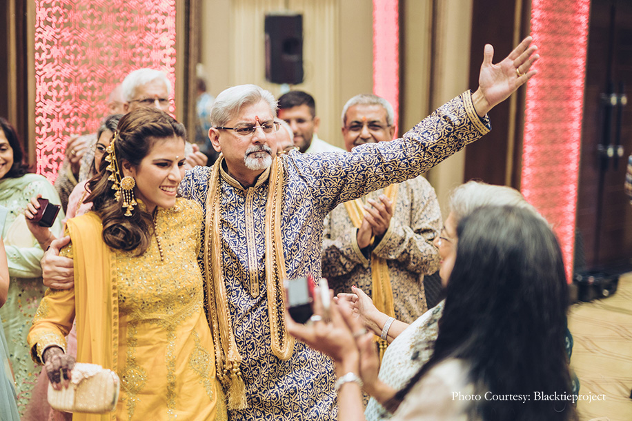 Staying true to tradition, the groom sported a blue and gold bandhgala ensemble, while his bride opted for a mustard yellow salwar kameez.