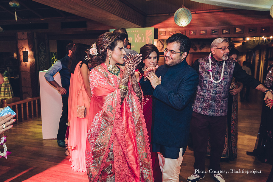 Being an ardent Harry Potter fan, the bride’s after-party post the cheery mehndi celebrations followed a ‘Harry Potter’ theme where the guests embarked on the ‘AB Express’ which was full of dance, games, and delicious treats. As the guests showed off their best moves under the dazzling disco balls, they also entertained themselves by playing a game of giant Jenga.