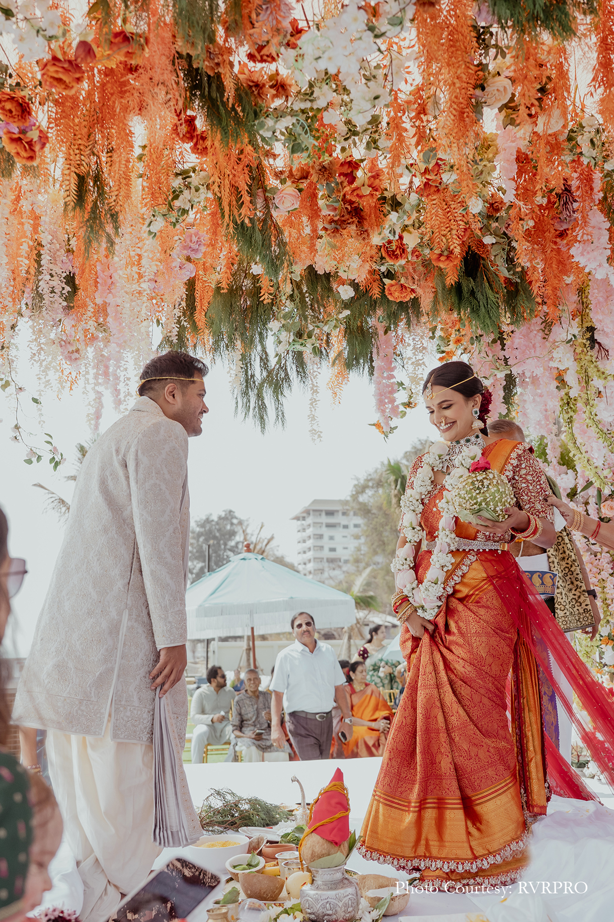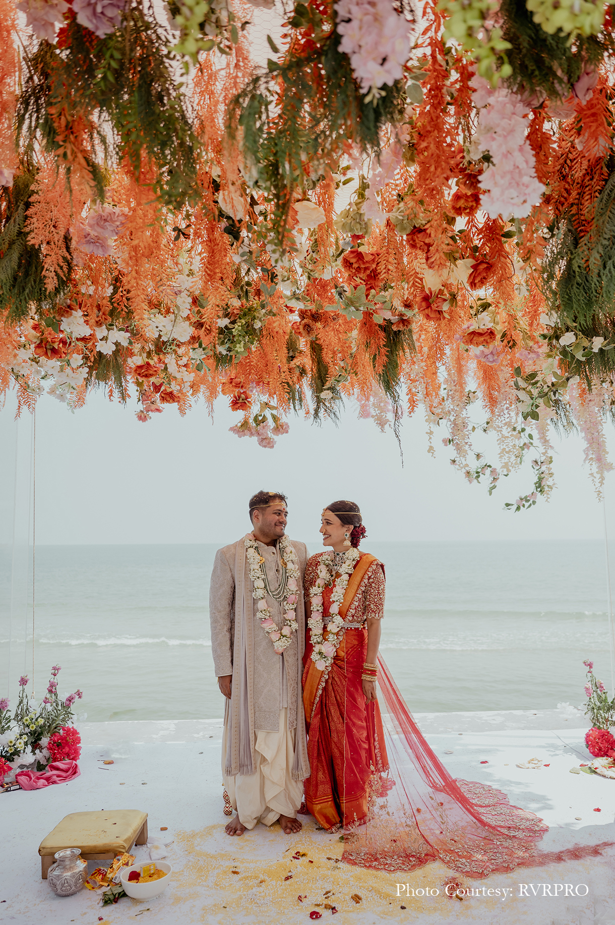 Staying true to traditions, the beachside wedding was a stunning affair. The white wedding mandap was an absolute stunner with its acrylic pillars, suspended blooms and foliage. The vivid blooms in the shades of pink, orange and peach cut a striking contrast against the light blue sky. Once the rituals were done, a burst of color bombs celebrated the newlyweds’ union.