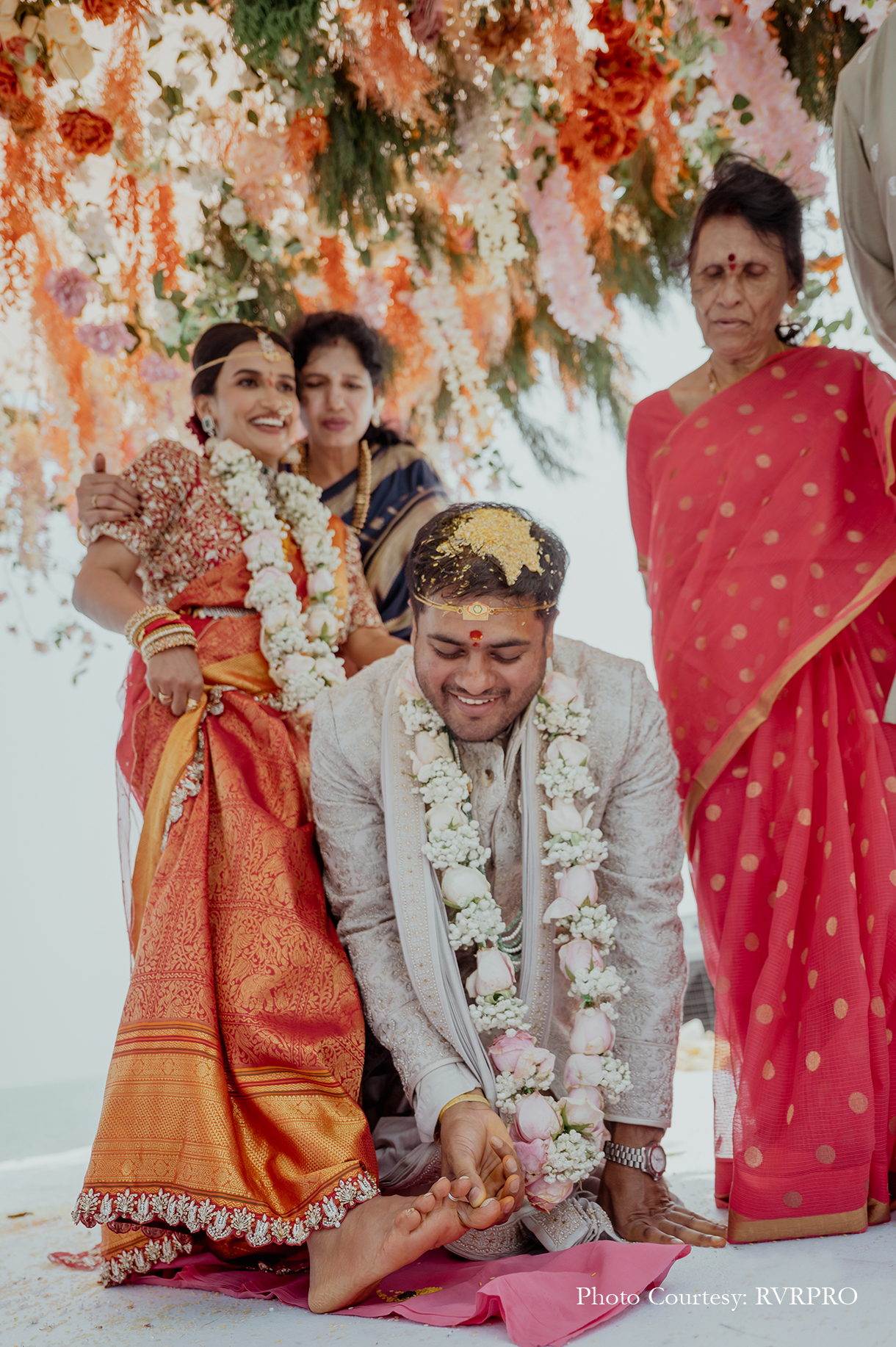 When in Thailand, a beachside celebration is essential! And, with their shared love for beaches, the couple had a blast as they shook a leg by the waves. Playing their favorite tunes and cheering their loved ones who thoughtfully performed a flash mob, Bhavya and Prahlad kicked off their celebrations in style.