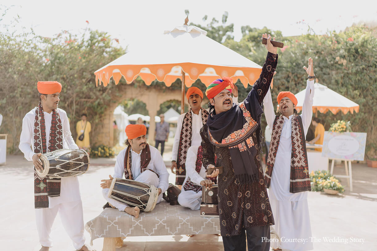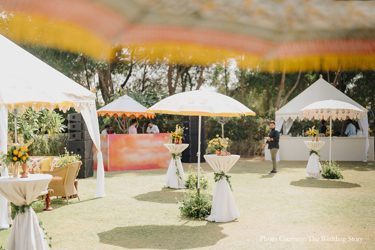 Karan from the planning team shares, “The arrival party of the guests was in a Royal Rajasthani fashion with classical musicians and folk dancers hosted at the Champa Garden. The couple wanted to complete the pheras on the first day so they could get a chance to participate in all the festivities fully. Therefore, the welcome lunch was actually a baraat brunch, complete with a DJ, dholwalas, and alternative Punjabi music. The decor was simple and festive with marigold arrangements combined with traditional Rajasthani tents to beat the heat. And, the spread consisted of Punjabi delicacies.”