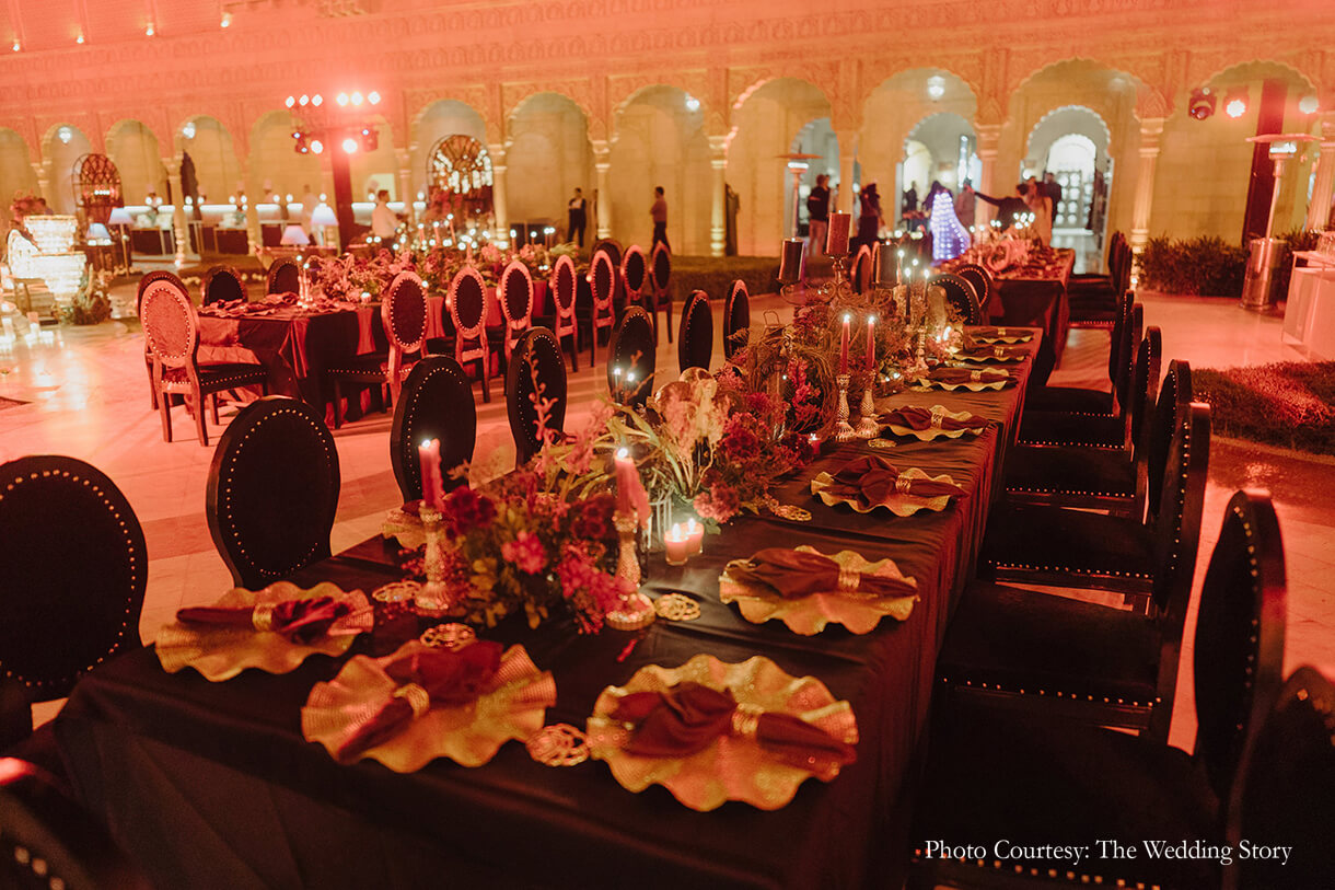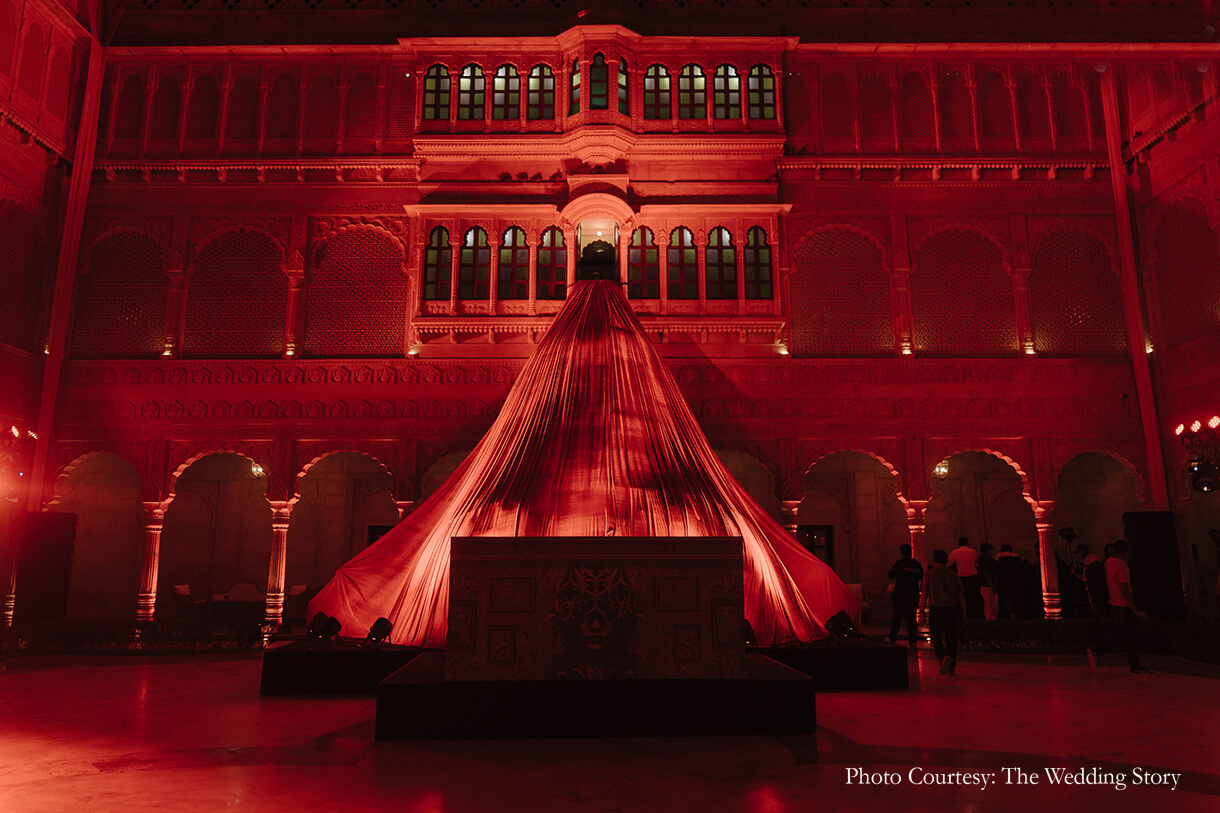 Karan shares, “The surrealist ball was eclectic, artistic, focusing on headgear. The decor was very gothic, minimal but outlandish characterized by chandeliers on the floor, tall slender gothic candles, reds and blacks. The walls of the venue were washed in crimson with long drapes that flowed down two stories. It was a dive into a dream world – a dystopian version of the 1970s that turned the courtyard of Suryagarh Palace into a surrealistic ball.”