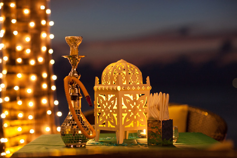 The celebrations commenced with a welcome dinner at The Deck where a pool party with an ‘All-White’ theme was organized. The Chinese paper lantern ‘Khoom-Loy’ was released as an auspicious start. The next day, the Mehndi was held over a lunch at Vanilla Sky Bar with the panoramic view of the Ocean. The theme for the evening Sangeet, was Moroccan. The colors were Blue and emerald green; low drapes and tons of fairy lights dominated the venue. There were mirrored-sheeshas all around and Arabic food was served.