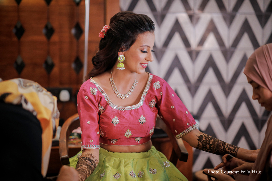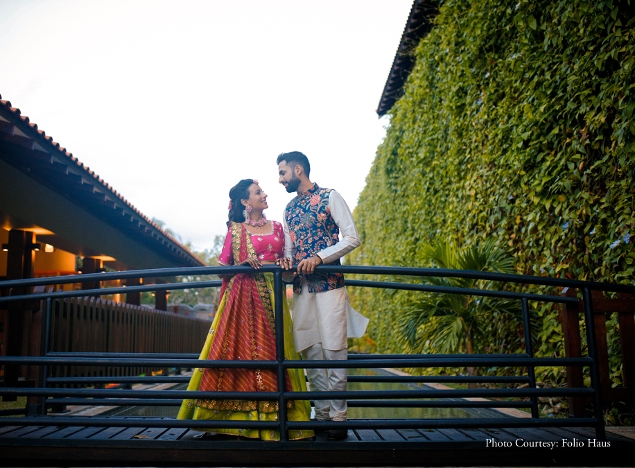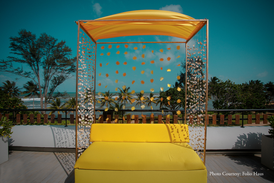 The haldi ceremony was an intimate affair which was attended by close family and friends. It was held at a rooftop venue of the hotel which resounded with the bride’s favorite Bollywood hits. With the bride, groom and most of the wedding squad clad in yellow, the decor was kept minimal and had hints of blue and green. A bridal seating spot created with cascading seashells was perfectly in sync with the location. Deeksha wore a gorgeous sari gifted by her mother, and Neeraj picked a matching yellow sherwani, for this fun event.