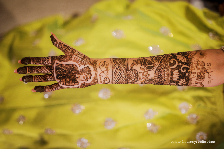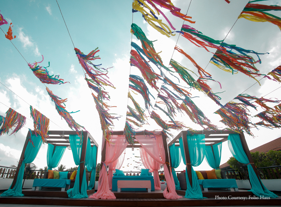 The mehendi ritual was the first function in the line up of festivities, and it was a colorful soiree of ocean blue and pink. Inspired by Sri Lankan local markets, the paper streamers and origami boats made for a unique and quirky decor element, the entertainment segment had a fun game of antakshari hosted by the Best Man and Maid of Honor. All food and drinks were laid out on self serve tables, and included delicious items like king coconuts, sangria and lion beer. The bride donned a colorful ensemble and floral jewellery, while the groom wore a bandi vest from Manyavar which had an intricate floral design.
