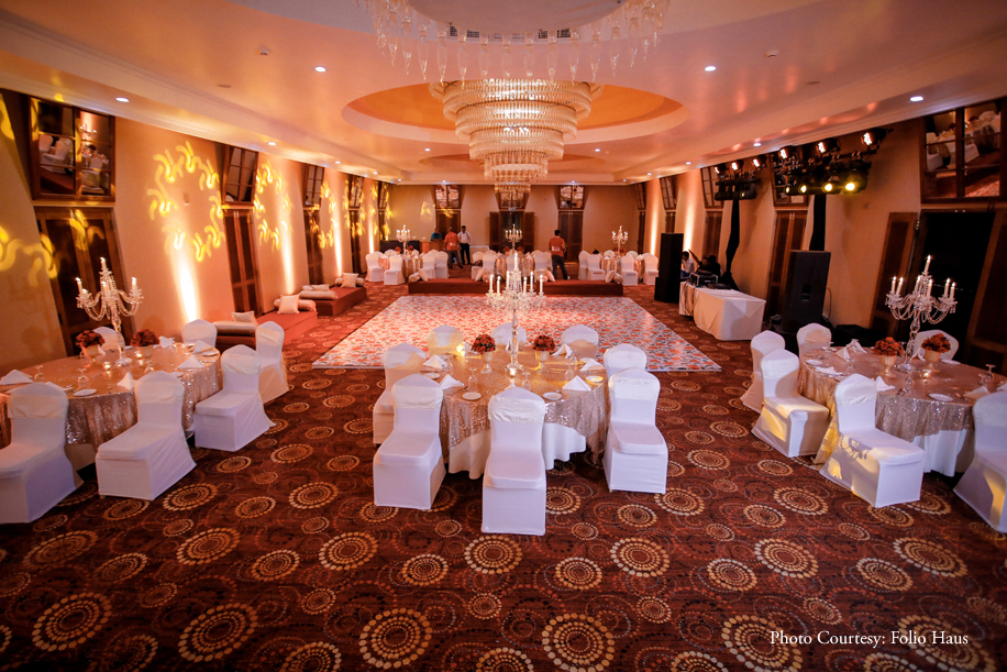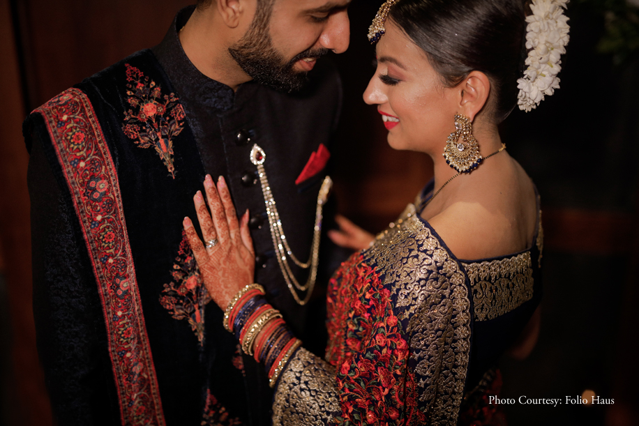 The reception was a night high on emotions with toasts and speeches, following which everyone walked on to the monogrammed dance floor to dance the night away. The decor of tropical plants against an ivory background was minimalistic and classic, and the couple wore a rich combination of black and red. The groom’s donned a creation from Manyavar, while the bride opted for a gorgeous embroidered sari gifted to her by her mom.