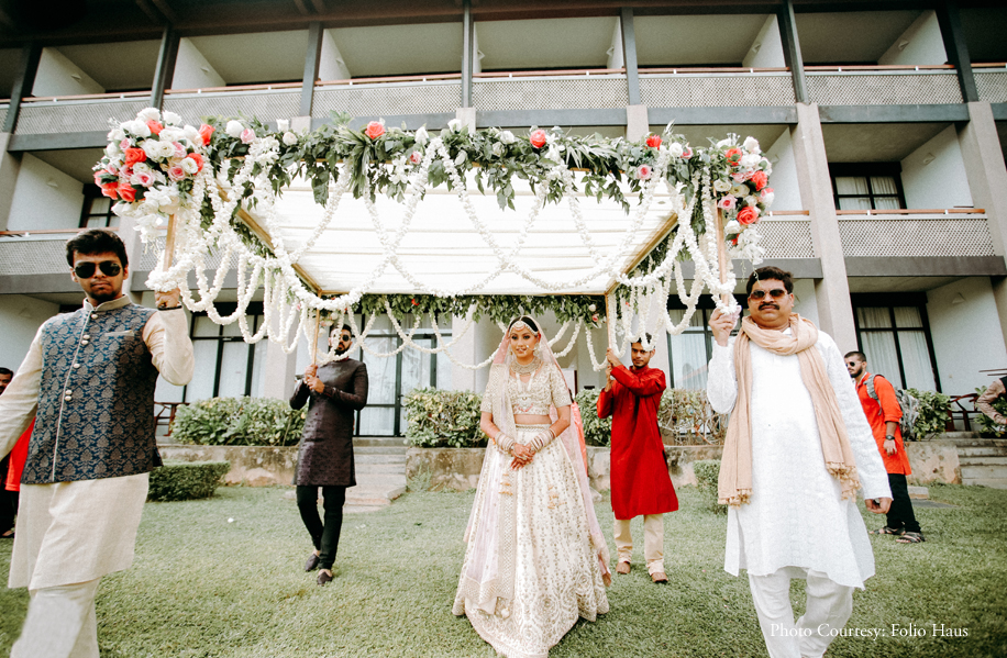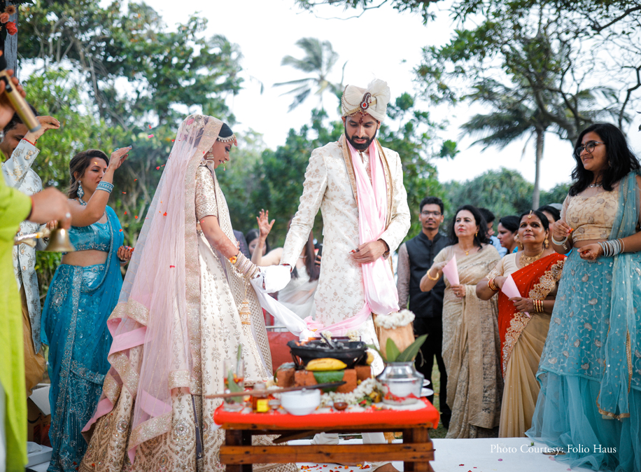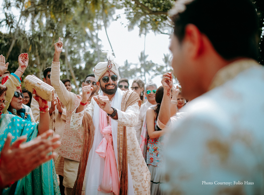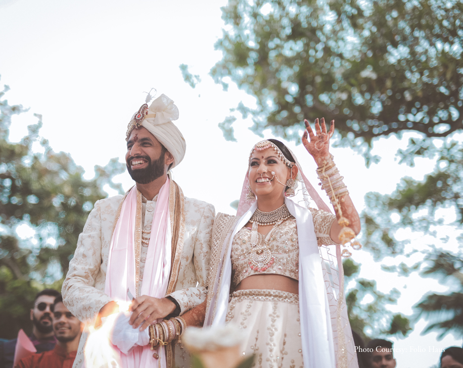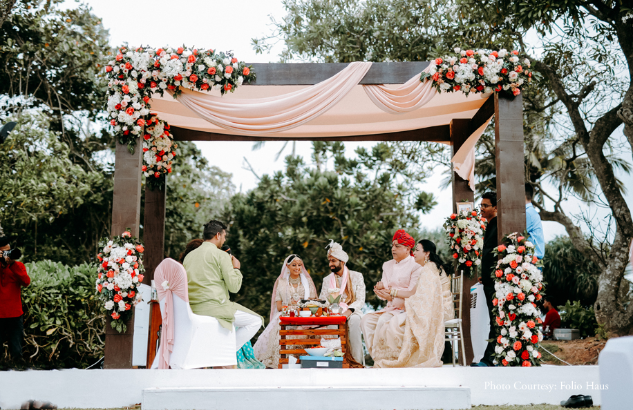 Set in the lawn by the breathtaking beachfront, the wedding was resplendent with blush and peach accents, and so were the bride and groom. The baarat made their entry at the pool side, grooving to DJ Abhishek’s live music. Sri Lankan Kandyan dancers synchronizing their steps to drum beats playing Bollywood music and performing acrobatics which made for a dramatic spectacle as the couple made their entry. Neeraj and Deeksha both got teary-eyed as they made their way to the mandap, before they exchanged their garlands made of blush-hued roses and seashells.