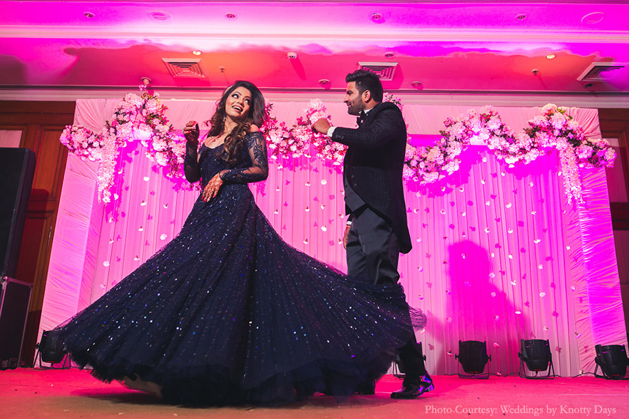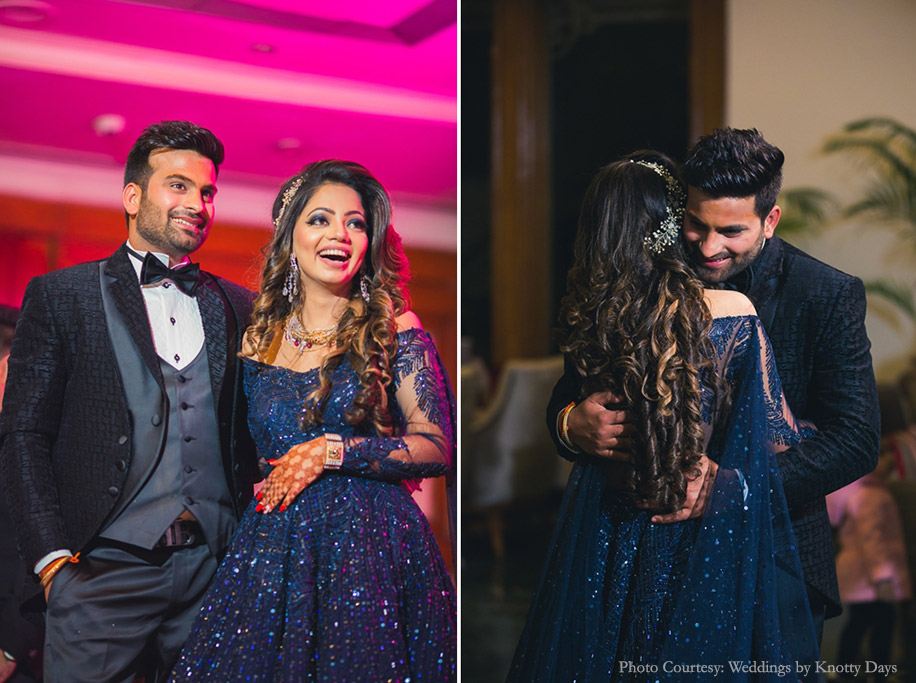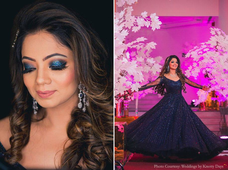 “Dhruv and I envisioned the décor and our planners executed it perfectly. We wanted an English Autumn feel with crystals, white foliage and a tint of blue. The stage was covered in pastel flowers with little hearts suspended from above.”
