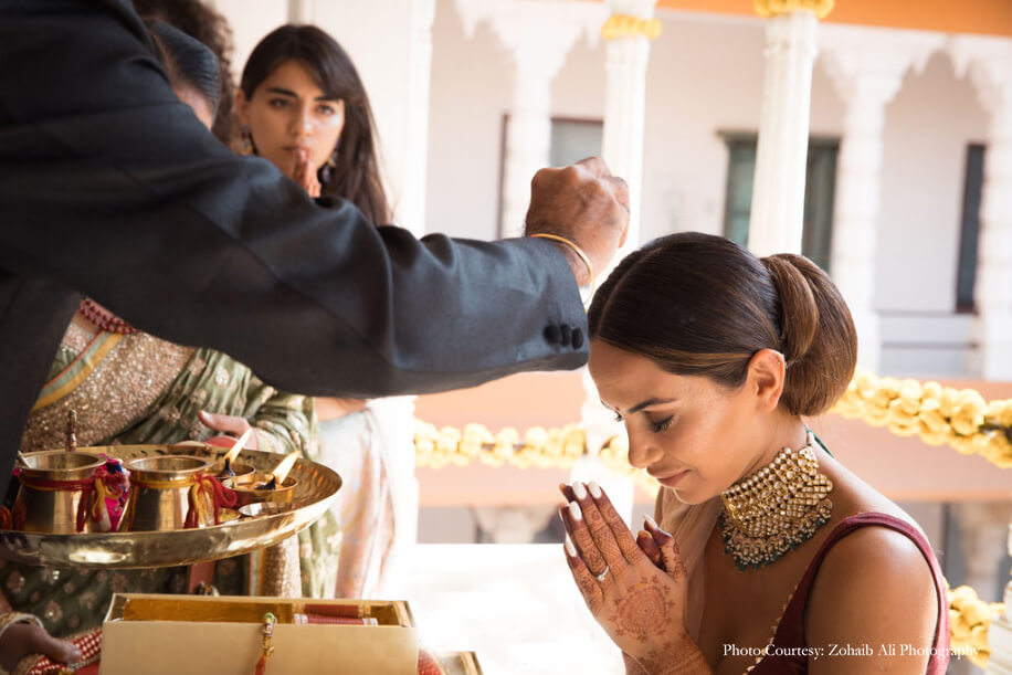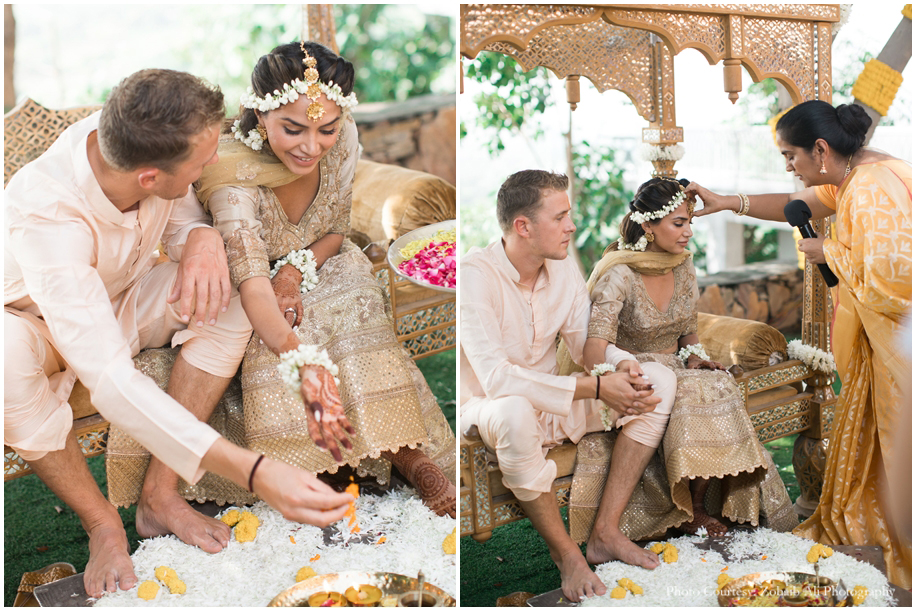 The haldi function took place on the next day, and Diipa shared that it was her favorite event on her Instagram account. Friends and family had a great time applying turmeric paste on Oleg and Diipa. She kept her look for this function simple yet ethnic with just a touch of blush and pink lips, and floral jewellery in the form of bracelets, a ‘matha patti’ (forehead ornament) and a garland attached to her tresses. Her silky light brown Ritu Kumar ensemble with delicate gold thread embroidery paired well with Oleg’s white traditional Indian outfit. The color of her attire also matched the decor hues, especially the pavilion under which the couple sat during the ceremony.