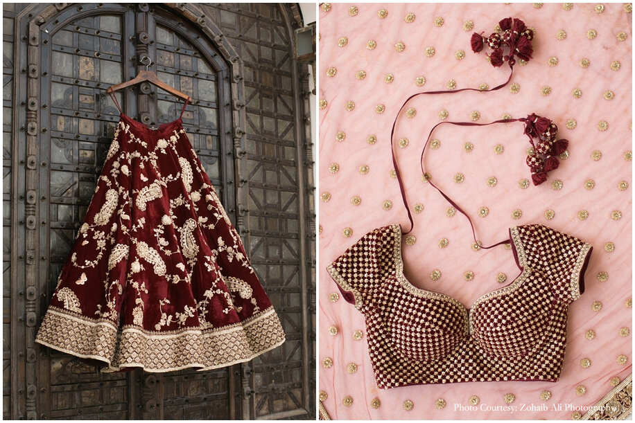For the wedding, Diipa wore a dark maroon lehenga by Sabyasachi. The skirt was resplendent with floral embroidery and included a dupatta with a broad border. Her jewellery for the big day included an ornate gold choker set, a ‘matha patti’ (forehead ornament), hand ornaments and a set of beautiful bangles. Her bridal makeup was all about youthful freshness. Diipa eschewed the glamorous look and opted for dewy skin and a light blush. She chose fragrances by Jo Malone London to give each room at the venue its own evocative, elegant scent.