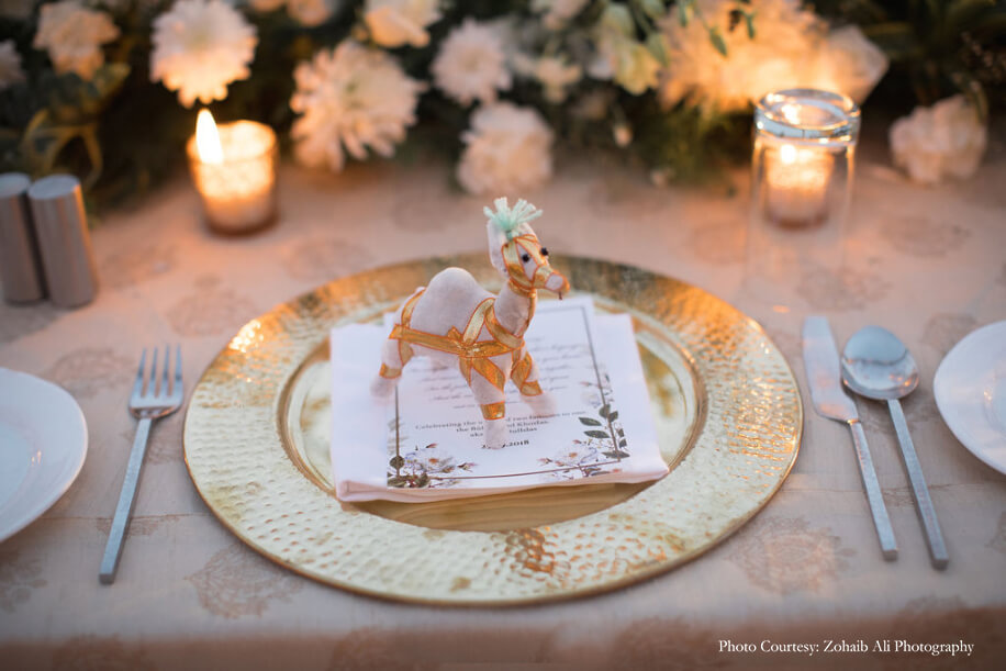 For the reception, Diipa pushed the fashion envelope in a dazzling Manik Jassal blue blouse paired with a ivory skirt. Later that night, she changed into a Faraz Manan ensemble that was modern and comfortable. She wore her hair in loose curls with a side parting and amped up the glamour quotient with the diamond jewellery. The groom complemented his ethereal bride in a classic Sabyasachi creation. Whimsical and romantic garden inspiration was the decor theme for this evening and the setup was brimming with interesting details as Diipa incorporated cute puppet animals and kaleerein in her reception dinner setup.