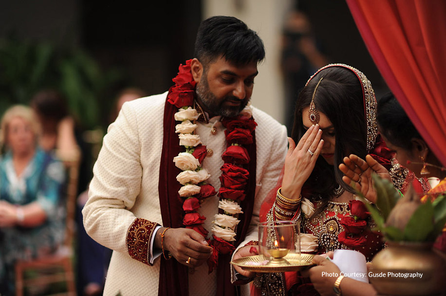 Red was the consistent color at the lively Indian wedding by the poolside. Julie wore a traditional red lehenga with gold and silver embroidery paired with a net dupatta, which was complemented by Dipesh’s white sherwani and dupatta that matched the color of her outfit. The mandap, erected on a large wooden deck, was resplendent with red drapes around the pillars and canopy that were festooned with charming colorful floral arrangements.