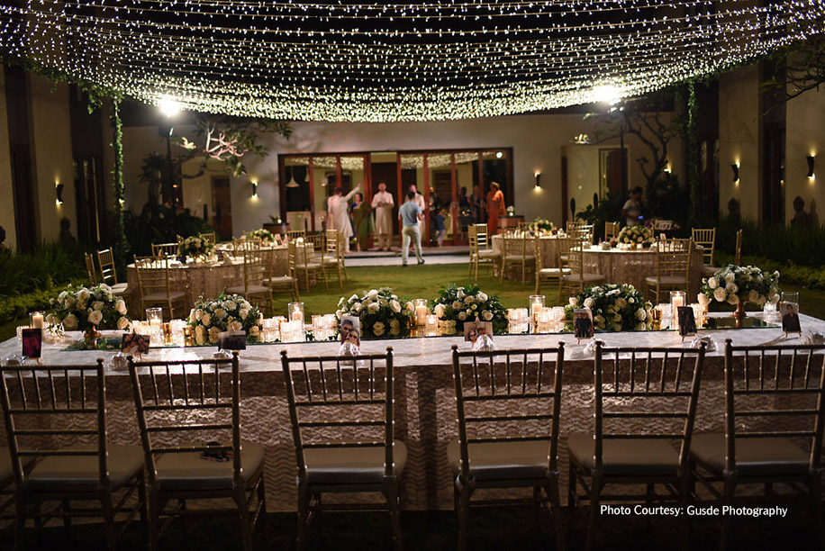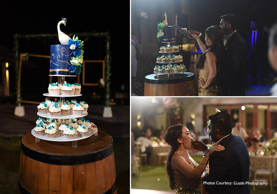 For the reception, Julie wore a gold sequined gown, and Dipesh looked handsome in a classic black suit. The exquisite cake by Ixora featured a peacock on the top and cupcakes on the bottom tier. Dazzling fireworks, fairy lights strung above the venue and the sense of joy and happiness marked the celebrations in a lovely way, making it an evening for all to remember.