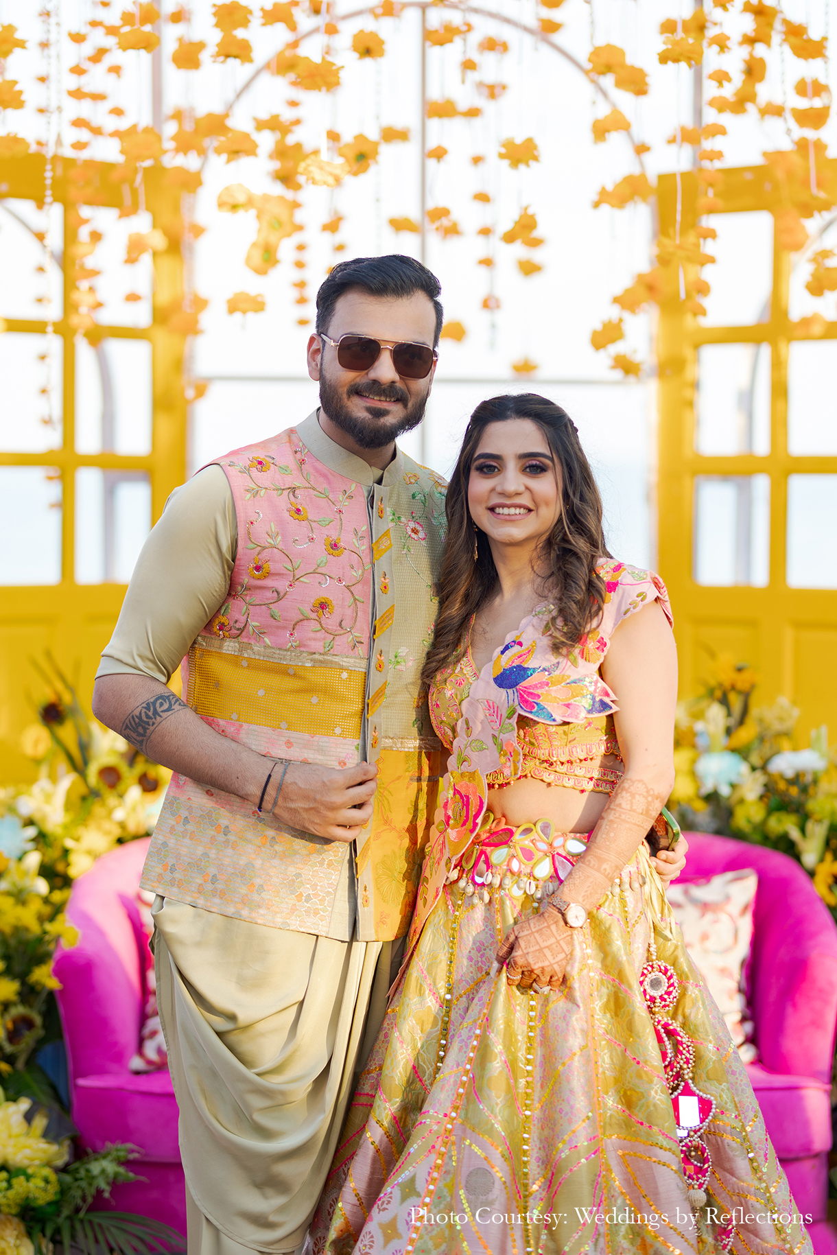 The mehndi was a vibrant celebration that cut a striking contrast against the sunlit, light blue sky. Canopies crafted out of rani pink and yellow drapes sheltered the guests and urged them to shake a leg on the dancefloor. Dainty yellow wall hangings, a bandhani-printed dancefloor and a stylish entry by the couple atop a tuk-tuk put everyone in a cheerful mood!