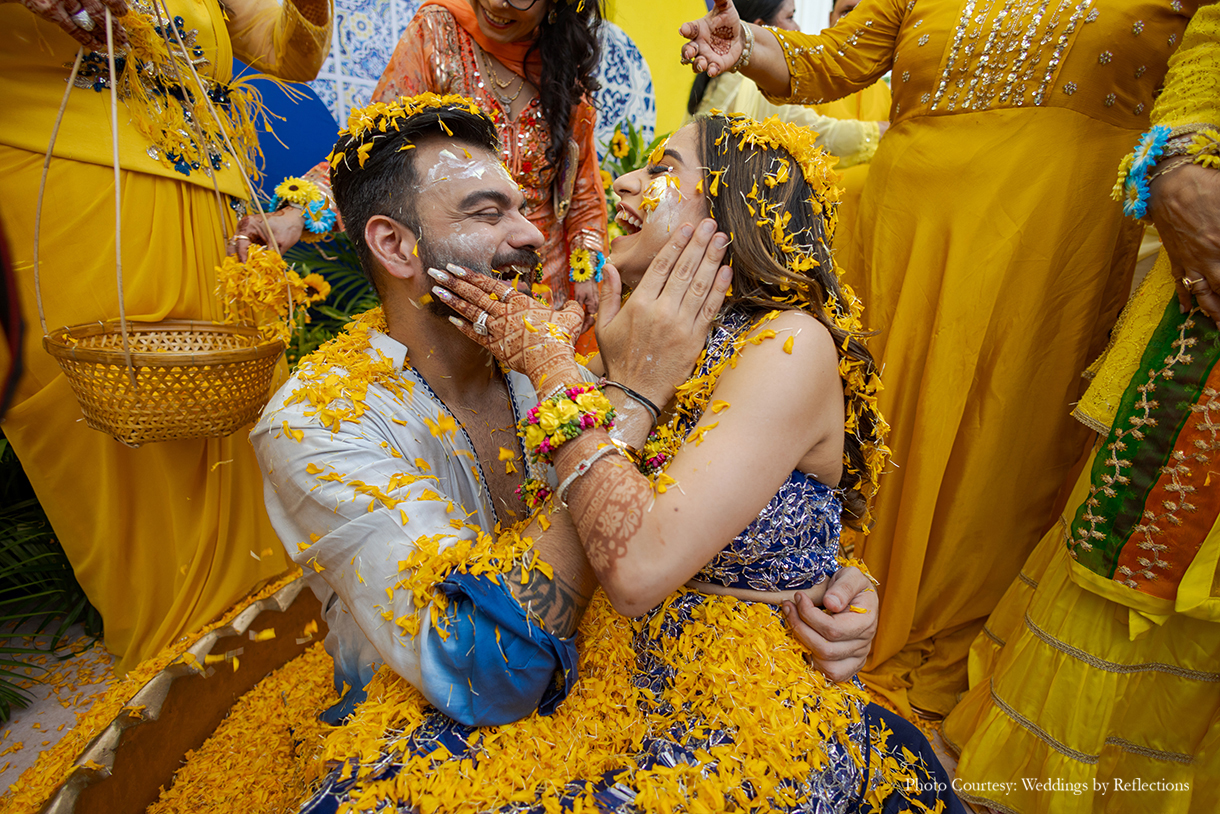 After the semi-formal welcome dinner, the couple kept it breezy and casual the next day with a boisterous haldi that was accompanied by a pool party. Basking under the sun, playing engaging games while slathering the couple with haldi – the guests made the most of the tropical weather! A picture-perfect flower shower paved the way for some amazing shots.
