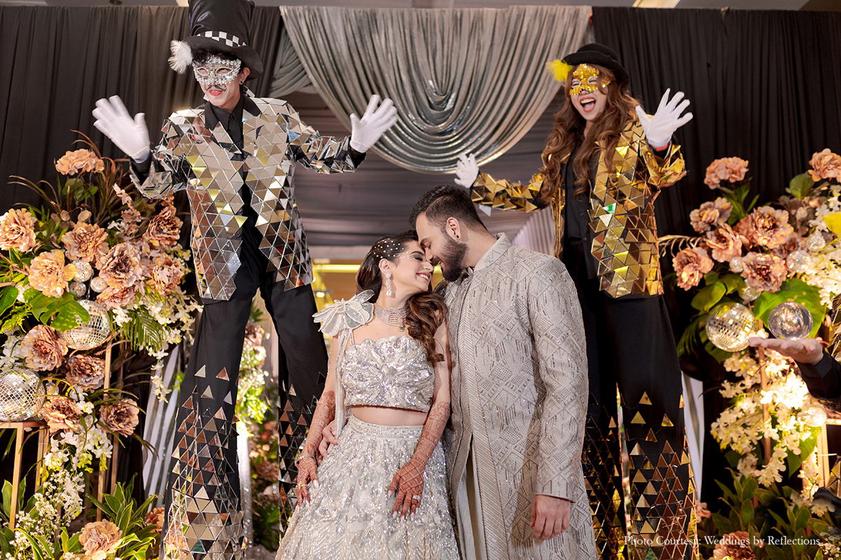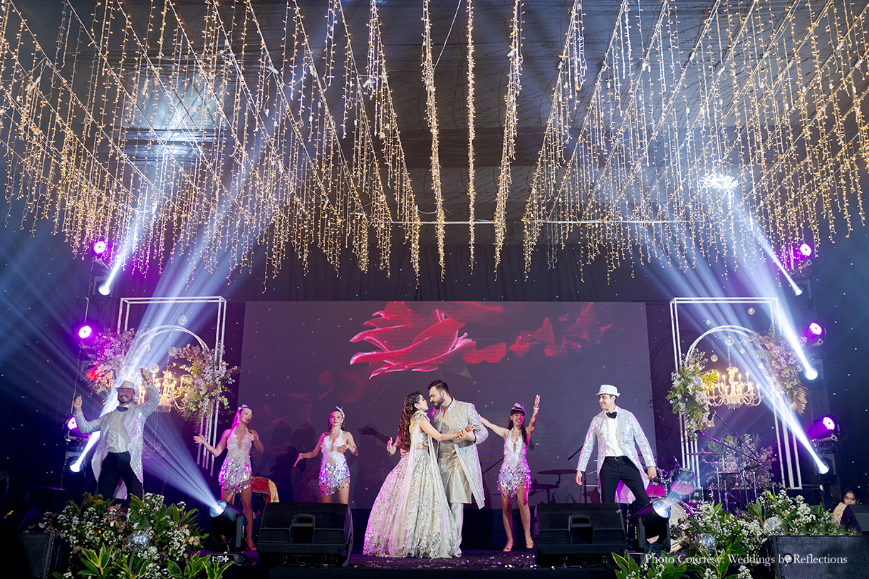 In the evening, a larger-than-life sangeet celebration awaited the wedding party! A ceiling filled with cascading fairy lights, entertaining performers, a monochrome chevron-printed dancefloor and a romantic ring exchange ceremony punctuated the event. Plus, live international artists ensured the dancefloor was full till the wee hours of the morning.