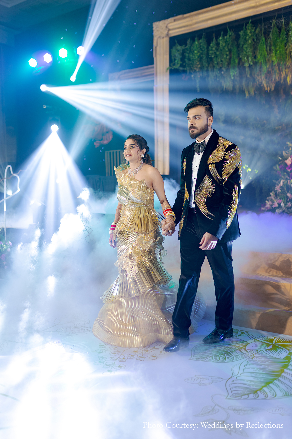 The reception followed an ‘enchanted garden’ theme where the guests were transported to a green, foliage-filled dreamland. Hosted indoors, the decor sported lush tropical leaves, gilded frames and dainty blooms that added a splash of color. Later, everyone took the dancefloor by storm as a live band gave an energetic performance!