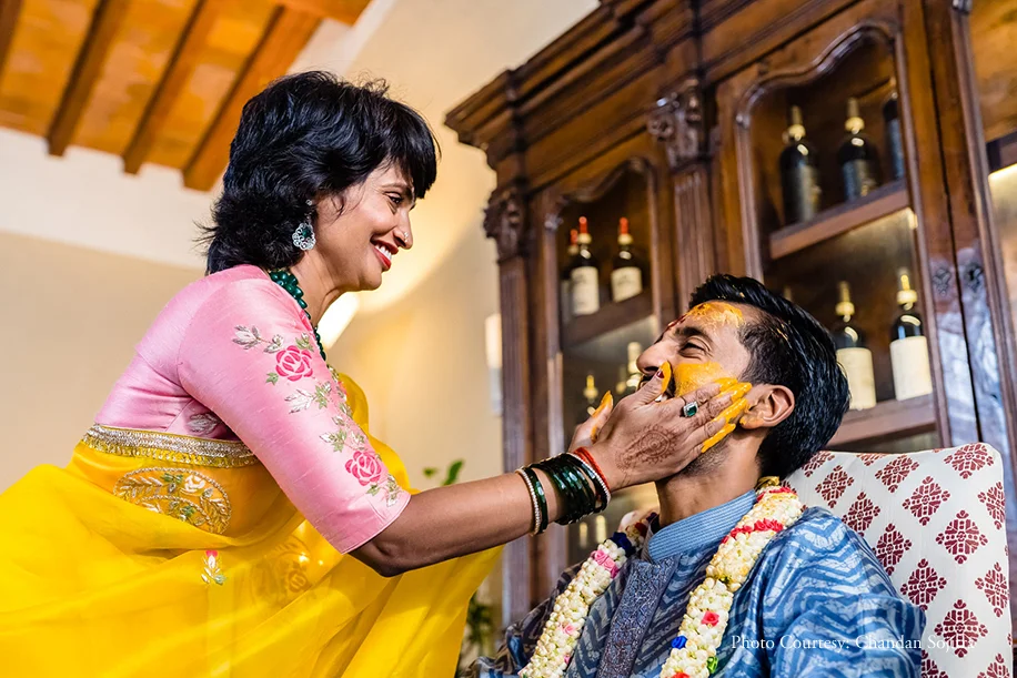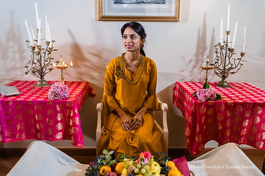 The celebrations kicked off with separate Haldi functions for both Divya and Vignesh. The intimate gathering was held for family and friends who had arrived by then, and incorporated minimal but traditional decor and customs. The groom wore a blue chevron print kurta from Kora, while the bride opted for a simple silk mustard kurta.